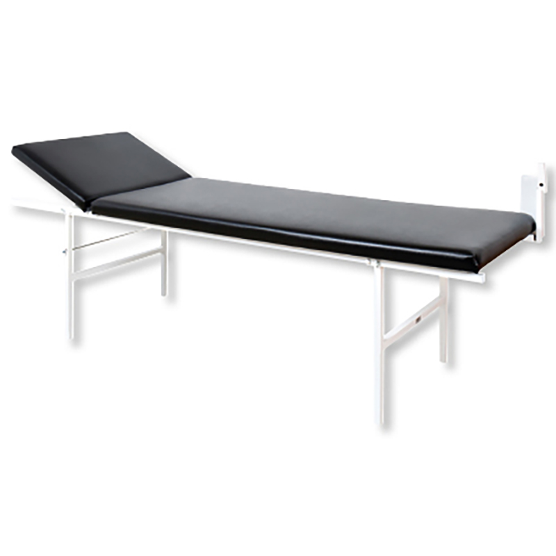 Der Klapp- und Haltemechanismus wird wahlweise an der rechten oder linken Längsseite der Liege angebracht und entsprechend der Liegenhöhe mit der Wand verschraubt. Bei Bedarf einfach Sicherung lösen, Beine ausklappen und absenken - die Sanitätsliege ist einsatzbereit. Nach Gebrauch Beine wieder einklappen, Liegefläche gegen die Wand und Sicherungshebel umklappen - schon gibt es wieder mehr Platz.