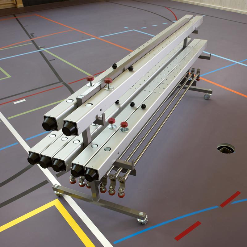 Pfosten aus eloxiertem Spezial-Leichtmetall. Höhenverstellung in 10cm Stufen von 80 bis 250cm. Die Pfosten werden mit einem Klemm-Mechanismus gesichert. Gesamtgewicht pro Pfosten ca. 17kg. Reckstangen aus nichtrostendem Spezialstahl, beidseitig mit Gabelkopf und Schraubverschluss. (Verdrehsicherung). Transportwagen zum Versorgen der Reckpfosten und Reckstangen.