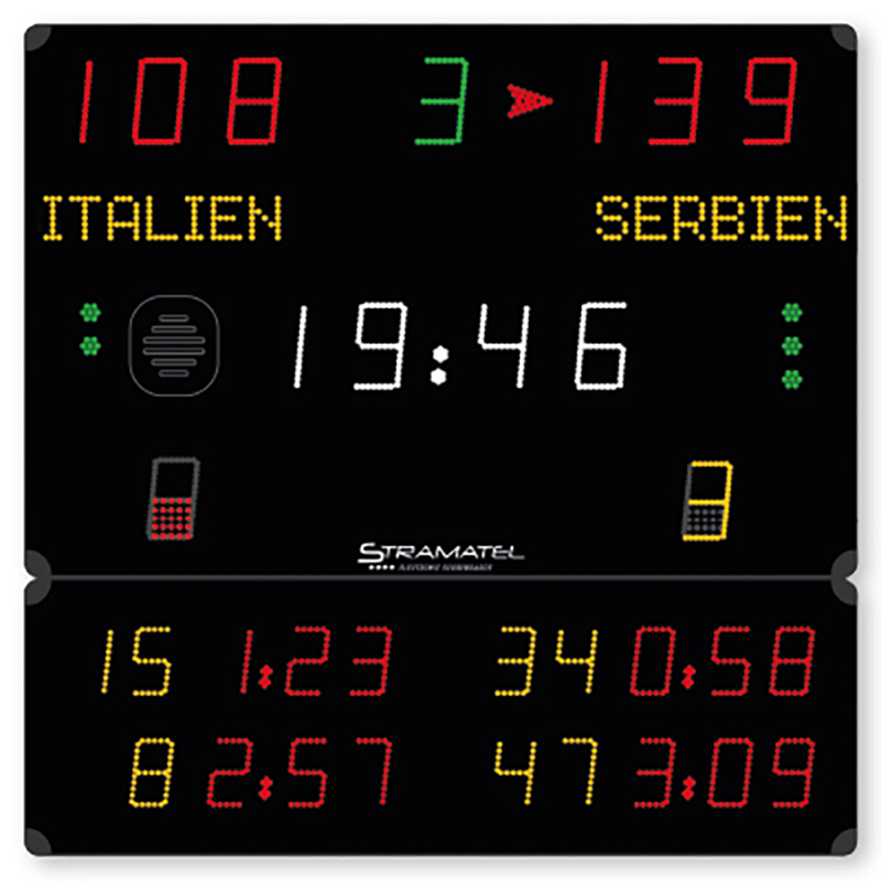 MULTISPORT Compact Serie, ideal für Handball, mit 2 Strafzeiten + bestrafte Spielernummer je Mannschaft, Ziffernhöhe 15 cm, Lesbarkeit 60 m,