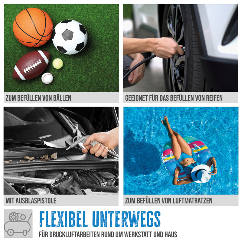 - inkl. Ausblaspistole, Ballfüllpistole, Fahrradventil und Luftmatratzenventil Adapter