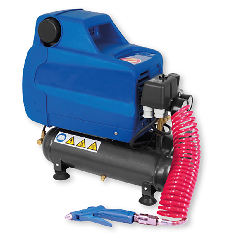 Kompressor 230 V mit Druckbehälter, ölfrei, 2x3 Liter Druckbehälter mit Entlastungsventil, Manometer, 222l/min, Gewicht 20 kg, komplett mit 4 m Spiralschlauch, Pistole und Nadelventil.