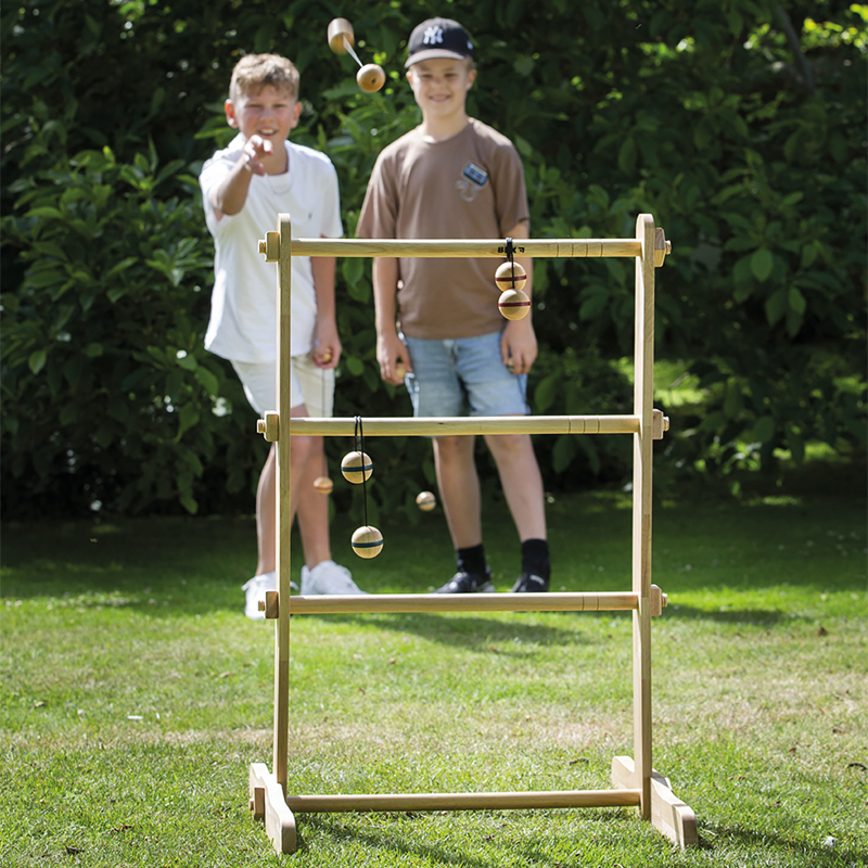 Das Leitergolf Original sorgt für spannenden Spielspaß im Garten, auf Partys, im Verein oder auch im Schulunterricht. Ziel ist es, die Wurfkugeln geschickt um die Sprossen der Holzleiter zu platzieren und dabei möglichst viele Punkte zu sammeln. Unterschiedliche Treffer bringen verschiedene Wertungen – ob alle Kugeln auf einer Sprosse oder verteilt auf mehreren. Dank der klappbaren Konstruktion lässt sich die Leiter leicht transportieren und platzsparend verstauen. Das Spiel ist aus hochwertigem Holz gefertigt, mit schützender Lackierung versehen und verspricht langlebigen Spielspaß für Kinder und Erwachsene – ideal für Pausenhof, Bewegungsstunden oder den Sportunterricht.