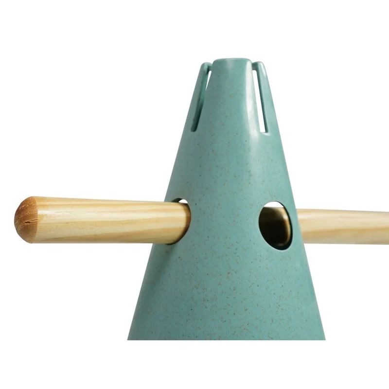 Die Bio-Lochkegel sind aus neuartigem treeNside-Material. Dahinter verbirgt sich ein Biokunststoffgranulat unter anderem aus Holzfasern. Bei der gesamten Produktion wird weitestgehend auf fossile Ressourcen verzichtet. Zudem lassen sie sich durch ihr leichtes Gewicht mühelos transportieren und somit schnell auf- und abbauen. Außerdem sind sie stapelbar, wodurch eine platzsparende Aufbewahrung möglich ist. Das natürliche Material des Kegels hält Temperaturen bis 35 °C sehr gut Stand. Es wird trotzdem empfohlen die Kegel vor intensiver Sonneneinstrahlung zu schützen, um die strahlenden Farben und die Form der Kegel lange zu erhalten. Abgerundet wird das Set mit vier Turnstäben, ebenfalls aus nachwachsendem Rohstoff, nämlich hochwertigem Kiefernholz, in der Länge von 100 cm.