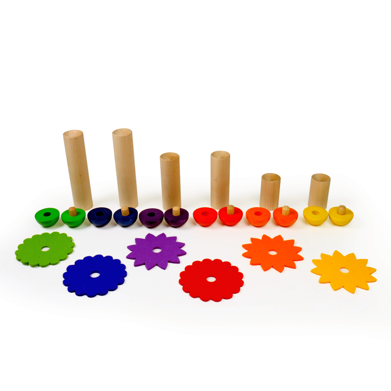 Ganz individuell oder nach Farben geordnet können Blüten zusammengesteckt und gestaltet werden. Die dicken Stäbe sind auf einer Seite nach innen gewölbt, so dass eine kugelförmige Blüte in der Wölbung Halt findet. So entstehen wunderschöne Blumen mit langem oder kurzem Stiel. Mit Geschick können die Blumen auch im Laufen balanciert werden. Z. B. mit jeweils einer Blume in beiden Händen. Die Blüten tanzen wie Kreisel auf der Tischplatte oder auf dem Fussboden, wenn sie in Schwung gebracht werden.