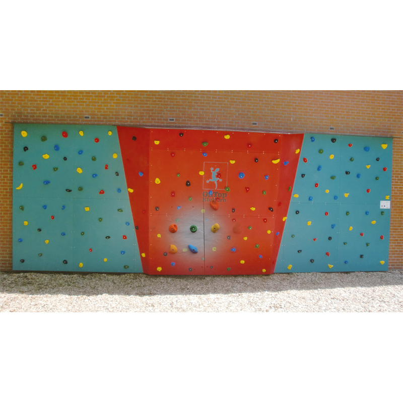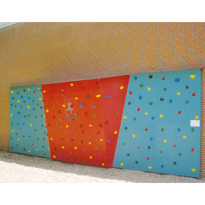 Grosse feststehende Outdoor Boulderwand für weiterführende Schulen. Die Boulderwand verfügt über einen grossen, 2,48 m breiten, Überhang. Zusätzlich befinden sich noch 3 Kletterstrukturen (kleine und grosse Pyramide und eine Struktur in Form eines Diamanten) auf der Kletterfläche. Paneleen aus hochwertigen, 21 mm starken Multiplexplatten mit Quarzsand-Harz Oberfläche mit einer Versiegelung speziell für den Aussenbereich. Einschlagmuttern und Befestigungsschrauben für die Klettergriffe sind aus Edelstahl. Das Dach besteht aus einer witterungsbeständigen Siebdruckplatte.