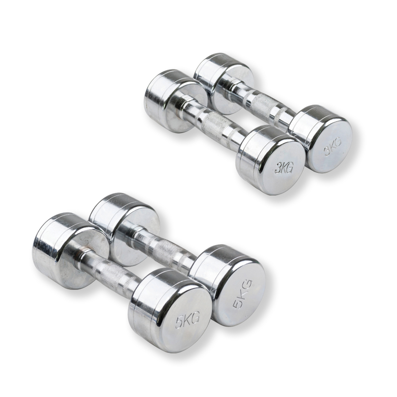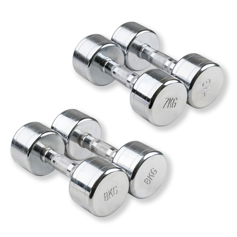 Der Hantelsatz ist aus verchromtem Stahl gefertigt, die Griffflächen der Hanteln sind gerändelt. Ideal für die Freihantelfläche in Fitness Studio und Verein, aber auch für Zuhause.