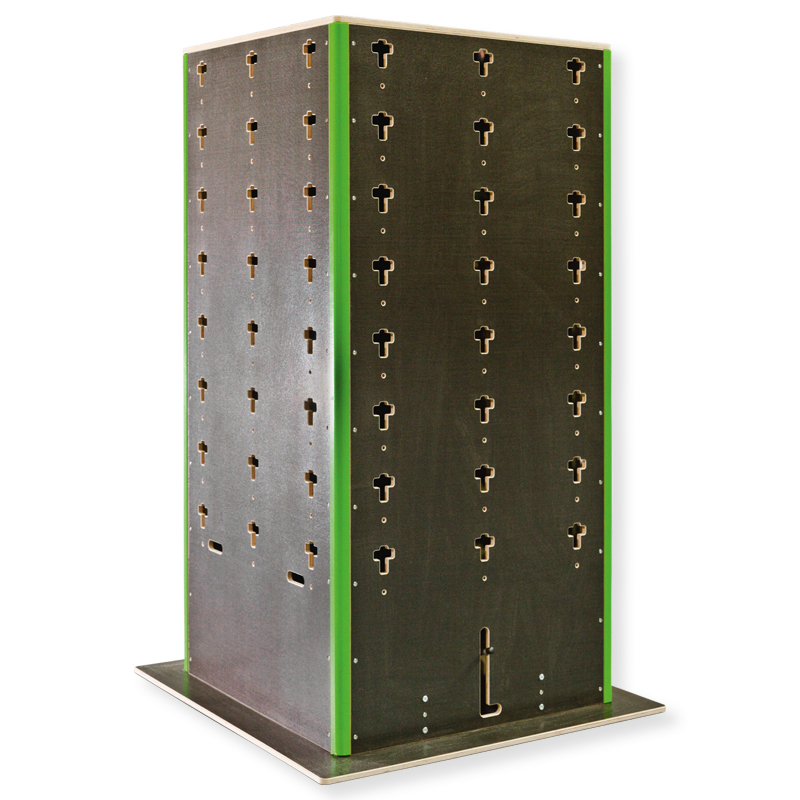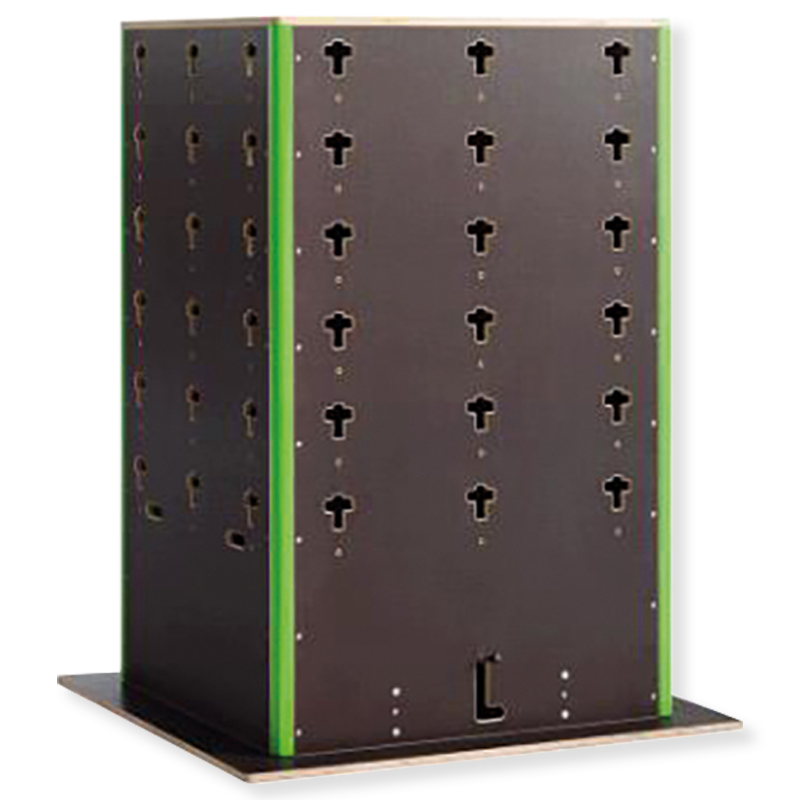 Multifunktionswand oder der Box genutzt werden. Eine Schrägwand ist für den Cube erhältlich, um daran akrobatische Übngen wie Saltos auszuüben oder zu klettern. Die Formate klein und gross sind mit Tür und Regal lieferbar..