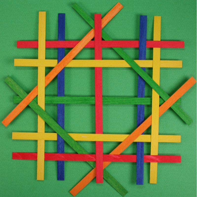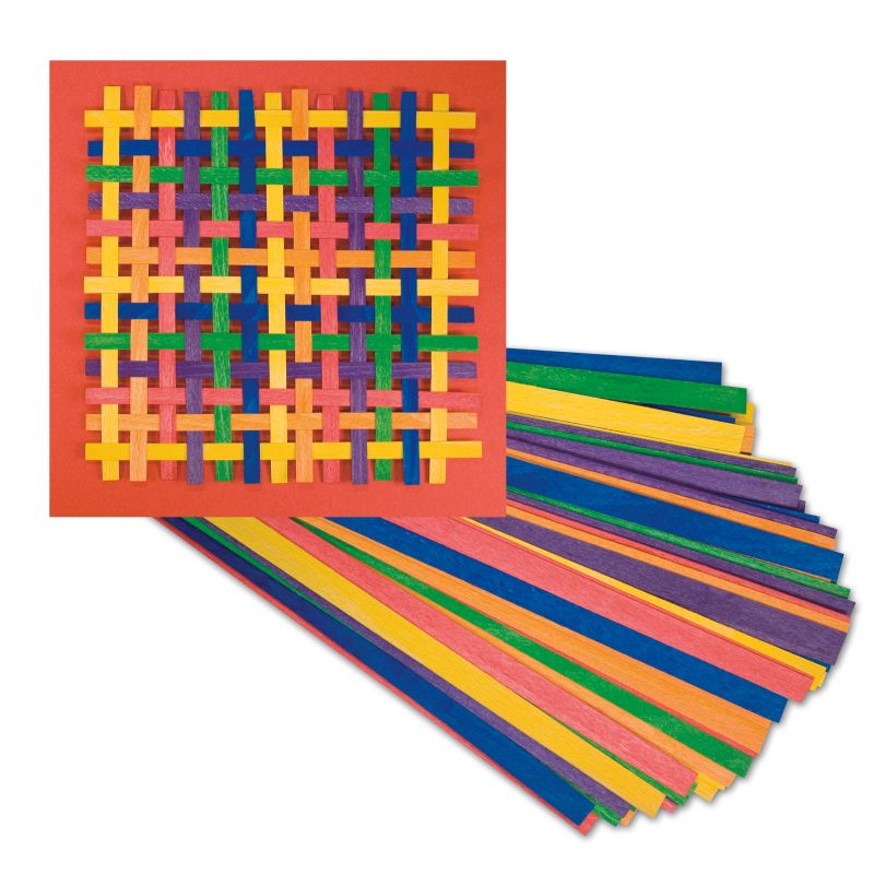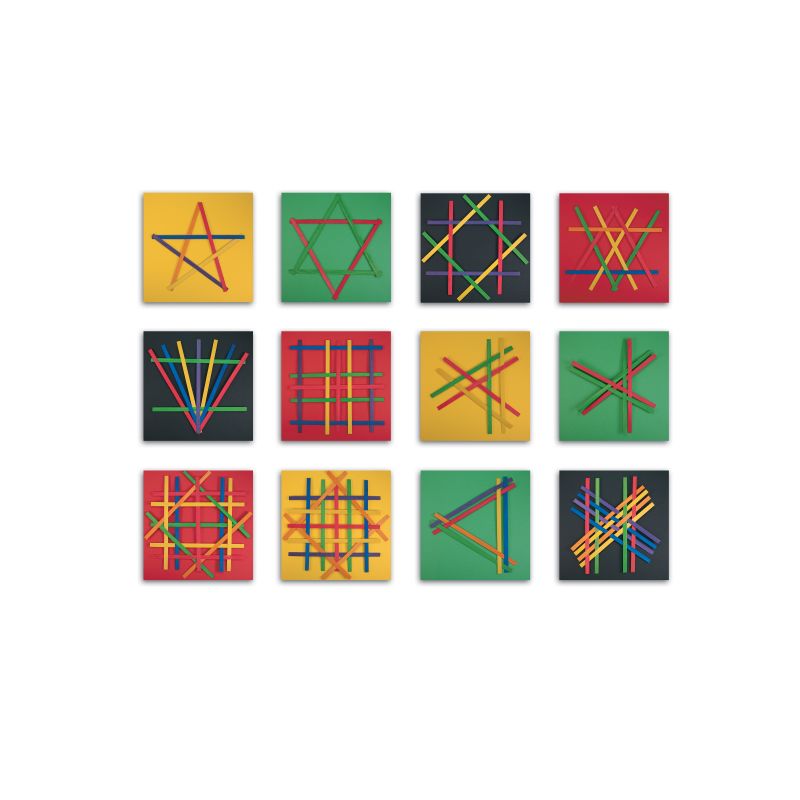 Es handelt sich nach Friedrich Fröbel um ein „Spiel mit Linien“, bei dem Holzspäne in den Farben des Regenbogens zu flächigen Mustern zusammengefügt werden. Die beiliegenden farbigen Kartons als Hintergrund für gestaltete Motive sind harmonisch auf die Farben der Holzspäne abgestimmt.