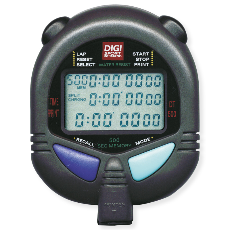 In dem Drei-Zeilen-Display werden beim Stoppen gleichzeitig Runden-, Zwischen- und die laufende Zeit angegeben. Rundenzeiten, Zwischenzeiten, Endzeiten, Schlagzahlen oder Geschwindigkeiten können gemessen und gespeichert werden. Ideal für das Leichtathletik Training auch mit grossen Gruppen. Die Stoppuhr verfügt selbstverständlich über das bewährte DIGI Druckpunktsystem für fehlerfreie Messungen.