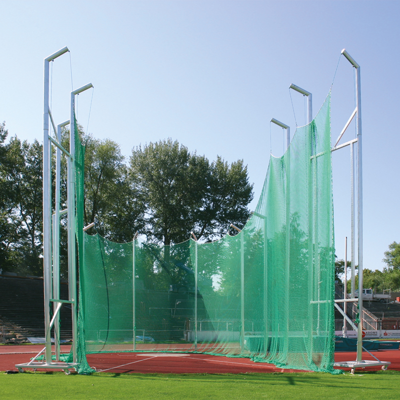Äusserst stabile Konstruktion aus Alu-Profil 80 x 80 mm, 8 Stützen mit Auslegern gewähren einen sicheren Stand. Schutzgitterhöhe 4,5 auf 5 m ansteigend. Nach vorn sind zwei grosse Klappen von 5 m Höhe angebracht. Diese Klappen können für Rechts- bzw. Linkswerfer fest arretiert werden. Als Schutz bei Nichtgebrauch der Anlage werden die Klappen auf 90° mit einem Profil gesichert. Lieferung in Alu-naturblank einschl. Netzhaken, Klappensicherung und Arretierung. Bodenhülsen mit Deckel bzw. Bodenrahmen je nach Ausführung der Anlage. Wichtig: Zur Vermeidung von Sturmschäden müssen die Schutznetze nach Gebrauch unbedingt abgenommen werden! Lieferung ohne Netz und ohne Hochziehvorichtung.