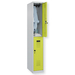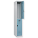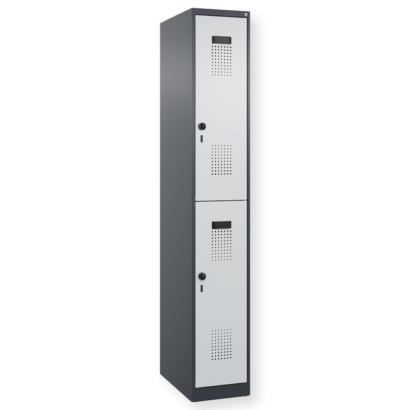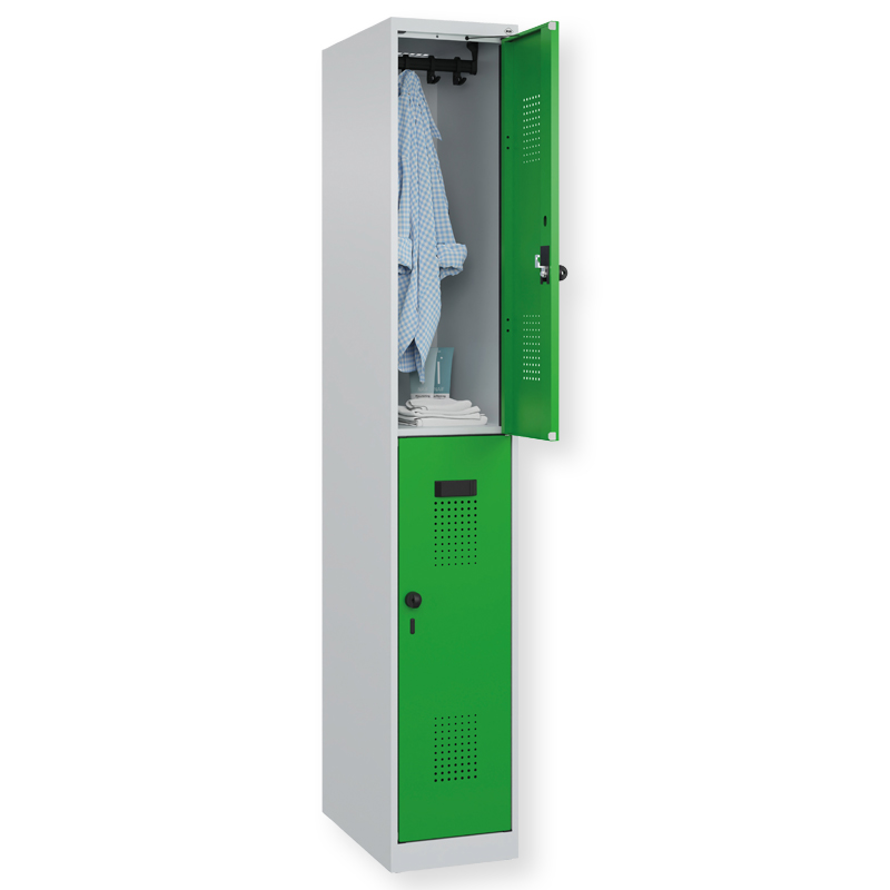 Doppelstöckiger Schrank Evolo PLUS, 1 Abteil mit 2 Fächern, Abteilbreite 300 mm, Korpus aus stabiler Stahlkonstruktion mit hochwertiger Einbrennbeschichtung für hohe UV- und Korrosionsbeständigkeit, geschlossene und abgeschrägte Seitenprofile für leichte Innenreinigung und komfortable Entnahme von Kleidung und Taschen, geeignet für verdeckte Kabelführung, mit hinteren Belüftungsöffnungen oben und unten, innen je Fach 1 stabile Garderobenstange aus Ovalprofil mit 3 verdrehsicheren Doppel-Schiebehaken inkl. Systemaufnahme, mit Bodengleitern als praktischer Schrank- und Fussbodenschutz, Türöffnungsbegrenzer 90 Grad, als Schutz vor Überdehnen der Tür, Tür(en) rechts angeschlagen, Stahl-Türen mit Soft-Anschlag und geschlossenen Seitenprofilen für höchste Stabilität, mit reinigungsfreundlichem Belüftungslochbild oben und unten, Aufhängung in stabilen Drehbolzen, 2 Ergonomische Sicherheits-Drehriegel für Vorhangschlösser mit Bügelstärke 6 bis 8 mm, inkl. Tür-Schutz, 2 Kunststoff-Etikettenrahmen, schwarz, selbstklebend, inkl. Klarsichtkunststoff-Abdeckung und weissem Etikett zur individuellen Beschriftung.