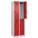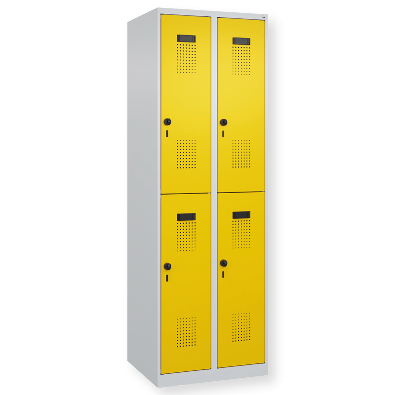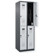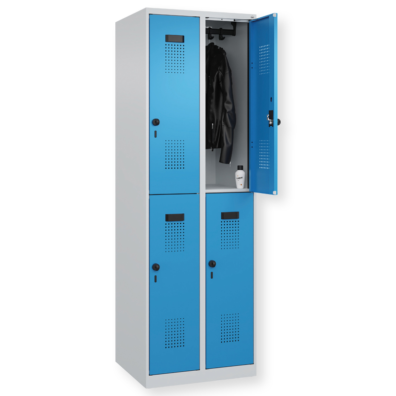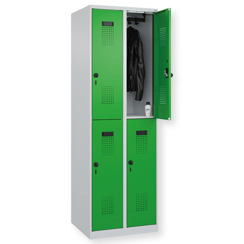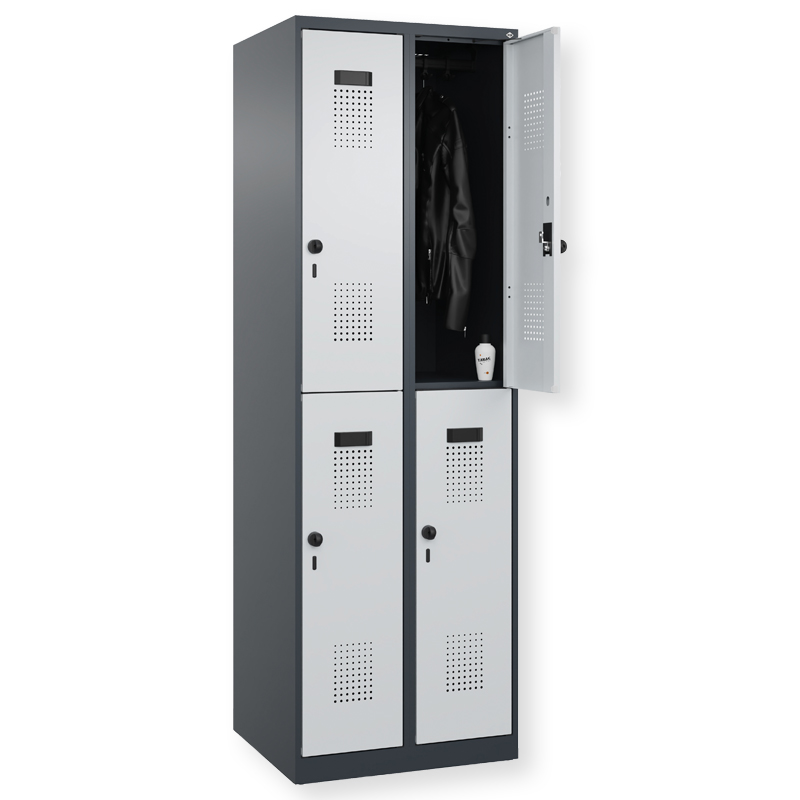 Doppelstöckiger Schrank Evolo PLUS, 1 Abteil mit 2 Fächern, Abteilbreite 300 mm, Korpus aus stabiler Stahlkonstruktion mit hochwertiger Einbrennbeschichtung für hohe UV- und Korrosionsbeständigkeit, geschlossene und abgeschrägte Seitenprofile für leichte Innenreinigung und komfortable Entnahme von Kleidung und Taschen, geeignet für verdeckte Kabelführung, mit hinteren Belüftungsöffnungen oben und unten, innen je Fach 1 stabile Garderobenstange aus Ovalprofil mit 3 verdrehsicheren Doppel-Schiebehaken inkl. Systemaufnahme, mit Bodengleitern als praktischer Schrank- und Fussbodenschutz, Türöffnungsbegrenzer 90 Grad, als Schutz vor Überdehnen der Tür, Tür(en) rechts angeschlagen, Stahl-Türen mit Soft-Anschlag und geschlossenen Seitenprofilen für höchste Stabilität, mit reinigungsfreundlichem Belüftungslochbild oben und unten, Aufhängung in stabilen Drehbolzen, 2 Ergonomische Sicherheits-Drehriegel für Vorhangschlösser mit Bügelstärke 6 bis 8 mm, inkl. Tür-Schutz, 2 Kunststoff-Etikettenrahmen, schwarz, selbstklebend, inkl. Klarsichtkunststoff-Abdeckung und weissem Etikett zur individuellen Beschriftung.