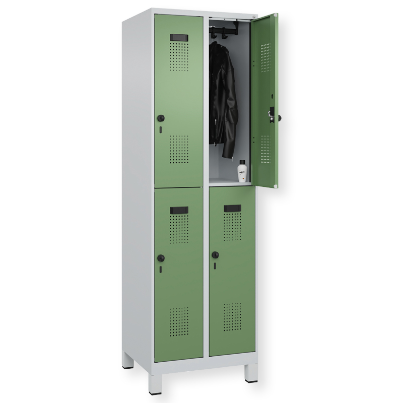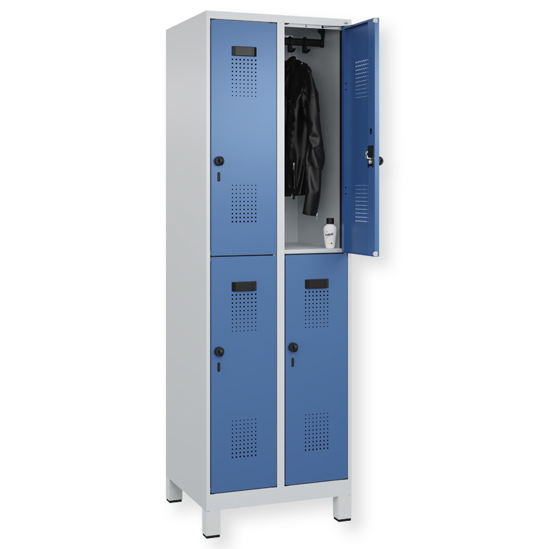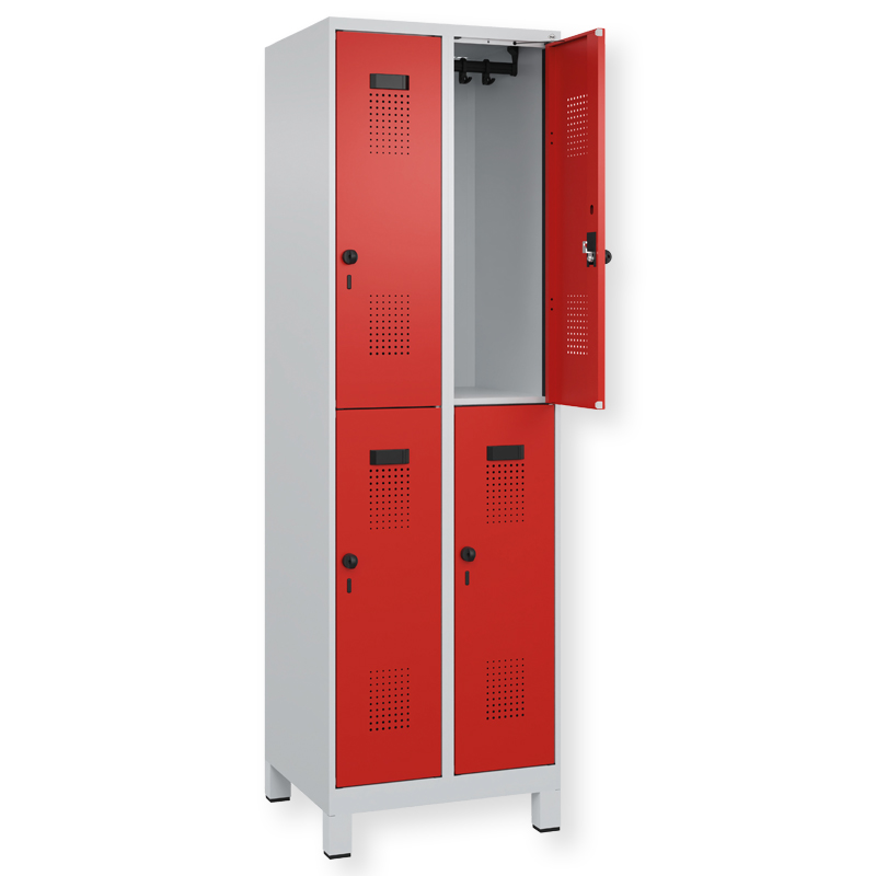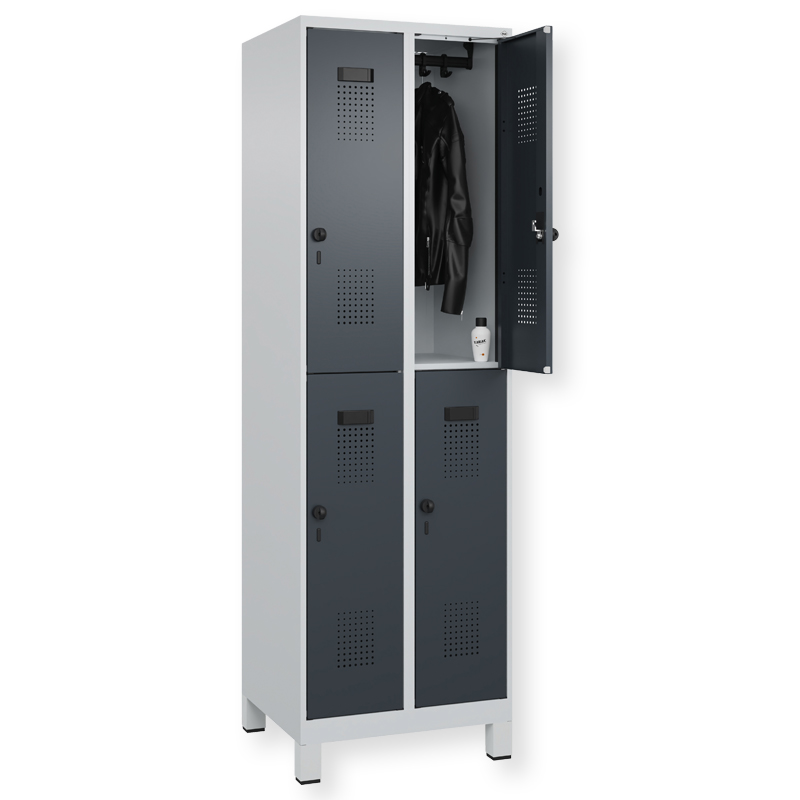 Doppelstöckiger Schrank Evolo PLUS, 1 Abteil mit 2 Fächern, Abteilbreite 300 mm, Korpus aus stabiler Stahlkonstruktion mit hochwertiger Einbrennbeschichtung für hohe UV- und Korrosionsbeständigkeit, geschlossene und abgeschrägte Seitenprofile für leichte Innenreinigung und komfortable Entnahme von Kleidung und Taschen, geeignet für verdeckte Kabelführung, mit hinteren Belüftungsöffnungen oben und unten, innen je Fach 1 stabile Garderobenstange aus Ovalprofil mit 3 verdrehsicheren Doppel-Schiebehaken inkl. Systemaufnahme, Türöffnungsbegrenzer 90 Grad, als Schutz vor Überdehnen der Tür, Tür(en) rechts angeschlagen, Stahl-Türen mit Soft-Anschlag und geschlossenen Seitenprofilen für höchste Stabilität, mit reinigungsfreundlichem Belüftungslochbild oben und unten, Aufhängung in stabilen Drehbolzen, 2 Ergonomische Sicherheits-Drehriegel für Vorhangschlösser mit Bügelstärke 6 bis 8 mm, inkl. Tür-Schutz, 1 100 mm hohe Füsse aus Kunststoff für erweiterten Korrosionsschutz, mit integrierter Niveauregulierung und Schutzhülsen zur stilvollen Abdeckung der Verstellschrauben, bequem von innen und aussen verstellbar, 2 Kunststoff-Etikettenrahmen, schwarz, selbstklebend, inkl. Klarsichtkunststoff-Abdeckung und weissem Etikett zur individuellen Beschriftung.