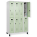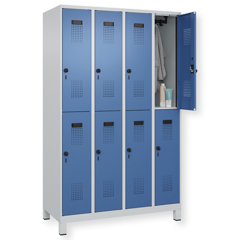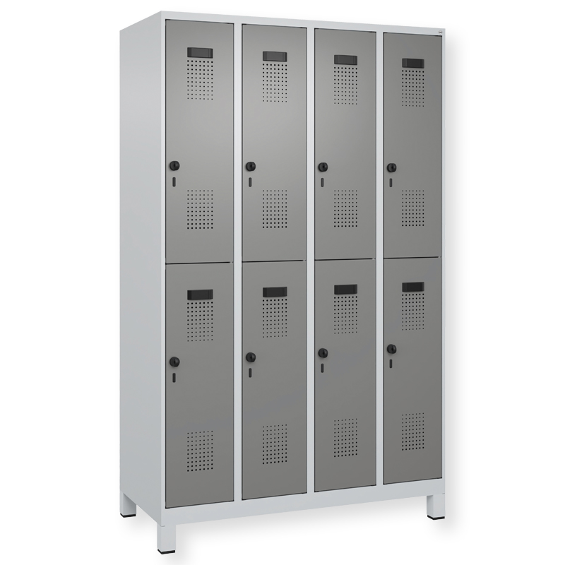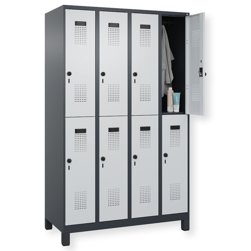 Doppelstöckiger Schrank Evolo PLUS, 1 Abteil mit 2 Fächern, Abteilbreite 300 mm, Korpus aus stabiler Stahlkonstruktion mit hochwertiger Einbrennbeschichtung für hohe UV- und Korrosionsbeständigkeit, geschlossene und abgeschrägte Seitenprofile für leichte Innenreinigung und komfortable Entnahme von Kleidung und Taschen, geeignet für verdeckte Kabelführung, mit hinteren Belüftungsöffnungen oben und unten, innen je Fach 1 stabile Garderobenstange aus Ovalprofil mit 3 verdrehsicheren Doppel-Schiebehaken inkl. Systemaufnahme, Türöffnungsbegrenzer 90 Grad, als Schutz vor Überdehnen der Tür, Tür(en) rechts angeschlagen, Stahl-Türen mit Soft-Anschlag und geschlossenen Seitenprofilen für höchste Stabilität, mit reinigungsfreundlichem Belüftungslochbild oben und unten, Aufhängung in stabilen Drehbolzen, 2 Ergonomische Sicherheits-Drehriegel für Vorhangschlösser mit Bügelstärke 6 bis 8 mm, inkl. Tür-Schutz, 1 100 mm hohe Füsse aus Kunststoff für erweiterten Korrosionsschutz, mit integrierter Niveauregulierung und Schutzhülsen zur stilvollen Abdeckung der Verstellschrauben, bequem von innen und aussen verstellbar, 2 Kunststoff-Etikettenrahmen, schwarz, selbstklebend, inkl. Klarsichtkunststoff-Abdeckung und weissem Etikett zur individuellen Beschriftung.