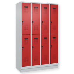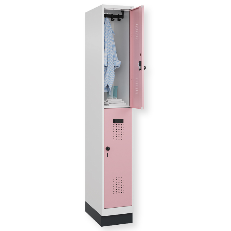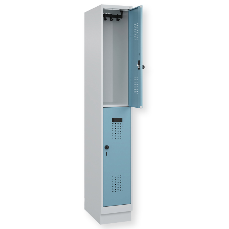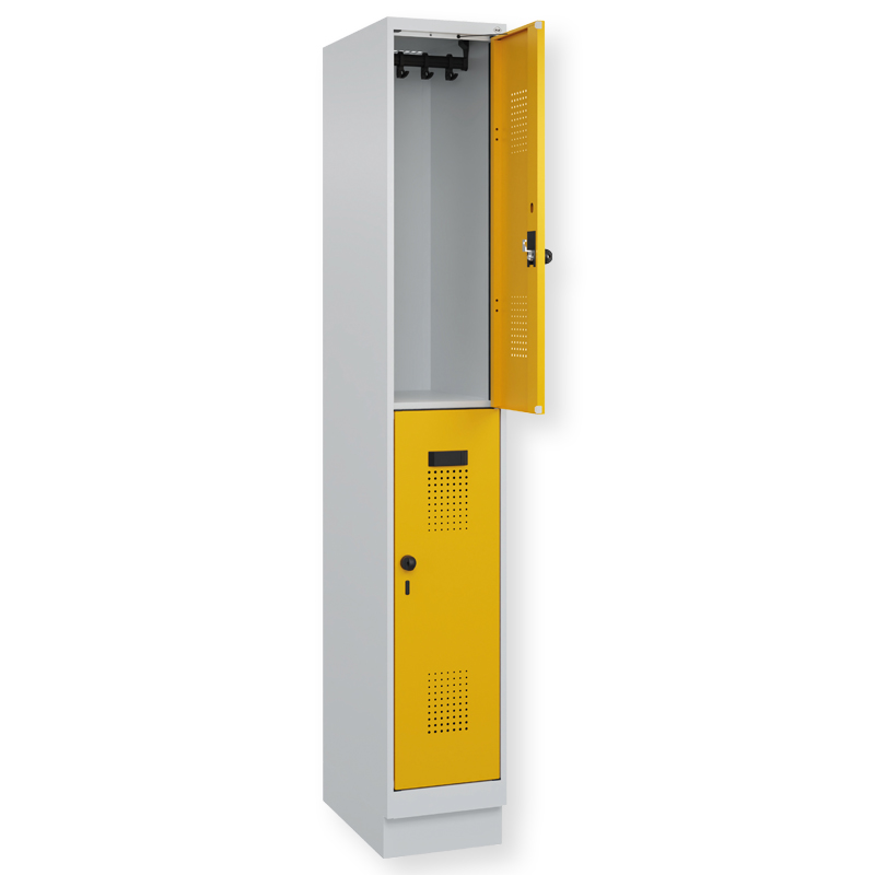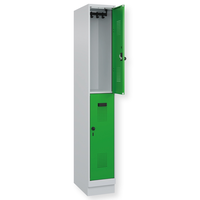 Doppelstöckiger Schrank Evolo PLUS, 1 Abteil mit 2 Fächern, Abteilbreite 300 mm, Korpus aus stabiler Stahlkonstruktion mit hochwertiger Einbrennbeschichtung für hohe UV- und Korrosionsbeständigkeit, geschlossene und abgeschrägte Seitenprofile für leichte Innenreinigung und komfortable Entnahme von Kleidung und Taschen, geeignet für verdeckte Kabelführung, mit hinteren Belüftungsöffnungen oben und unten, innen je Fach 1 stabile Garderobenstange aus Ovalprofil mit 3 verdrehsicheren Doppel-Schiebehaken inkl. Systemaufnahme, auf 100 mm hohem Sockel, mit integrierter Niveauregulierung, bequem von innen verstellbar, Türöffnungsbegrenzer 90 Grad, als Schutz vor Überdehnen der Tür, Tür(en) rechts angeschlagen, Stahl-Türen mit Soft-Anschlag und geschlossenen Seitenprofilen für höchste Stabilität, mit reinigungsfreundlichem Belüftungslochbild oben und unten, Aufhängung in stabilen Drehbolzen, 2 Ergonomische Sicherheits-Drehriegel für Vorhangschlösser mit Bügelstärke 6 bis 8 mm, inkl. Tür-Schutz, 2 Kunststoff-Etikettenrahmen, schwarz, selbstklebend, inkl. Klarsichtkunststoff-Abdeckung und weissem Etikett zur individuellen Beschriftung.