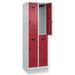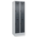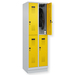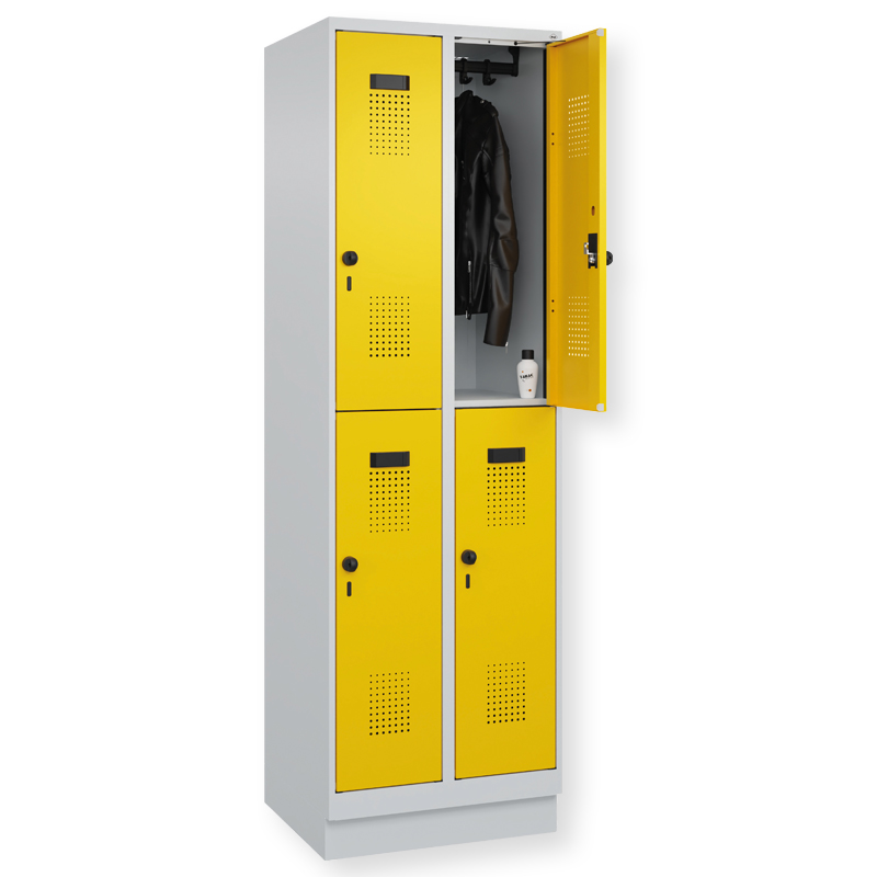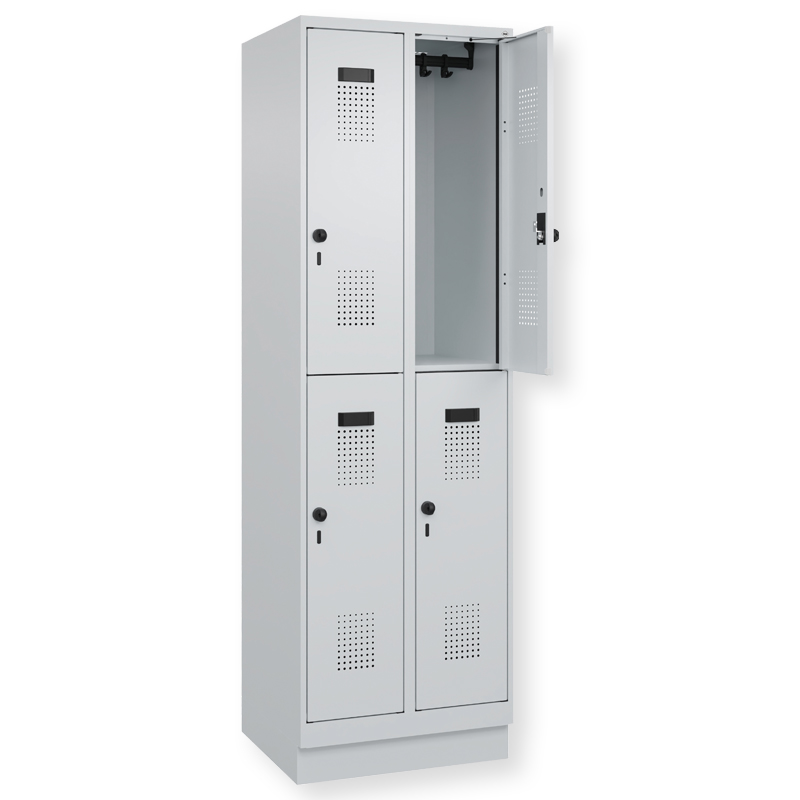 Doppelstöckiger Schrank Evolo PLUS, 1 Abteil mit 2 Fächern, Abteilbreite 300 mm, Korpus aus stabiler Stahlkonstruktion mit hochwertiger Einbrennbeschichtung für hohe UV- und Korrosionsbeständigkeit, geschlossene und abgeschrägte Seitenprofile für leichte Innenreinigung und komfortable Entnahme von Kleidung und Taschen, geeignet für verdeckte Kabelführung, mit hinteren Belüftungsöffnungen oben und unten, innen je Fach 1 stabile Garderobenstange aus Ovalprofil mit 3 verdrehsicheren Doppel-Schiebehaken inkl. Systemaufnahme, auf 100 mm hohem Sockel, mit integrierter Niveauregulierung, bequem von innen verstellbar, Türöffnungsbegrenzer 90 Grad, als Schutz vor Überdehnen der Tür, Tür(en) rechts angeschlagen, Stahl-Türen mit Soft-Anschlag und geschlossenen Seitenprofilen für höchste Stabilität, mit reinigungsfreundlichem Belüftungslochbild oben und unten, Aufhängung in stabilen Drehbolzen, 2 Ergonomische Sicherheits-Drehriegel für Vorhangschlösser mit Bügelstärke 6 bis 8 mm, inkl. Tür-Schutz, 2 Kunststoff-Etikettenrahmen, schwarz, selbstklebend, inkl. Klarsichtkunststoff-Abdeckung und weissem Etikett zur individuellen Beschriftung.