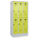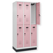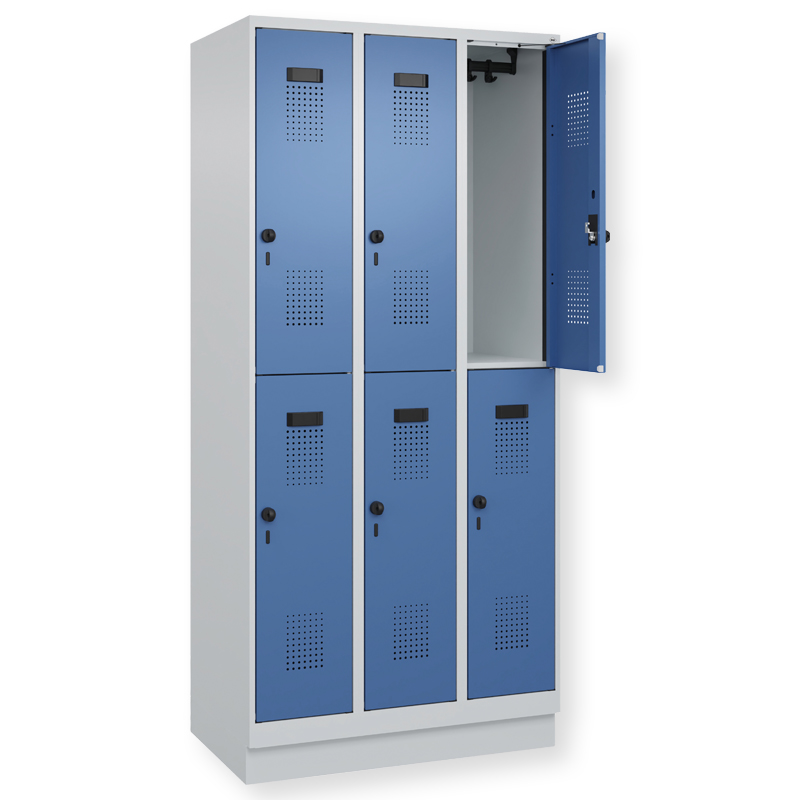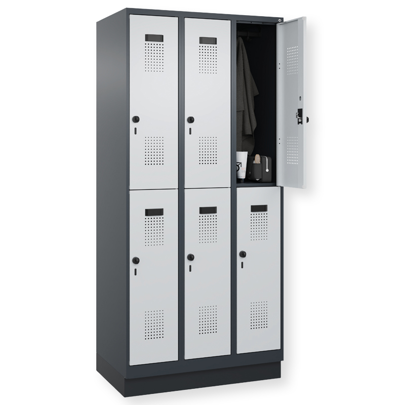 Doppelstöckiger Schrank Evolo PLUS, 1 Abteil mit 2 Fächern, Abteilbreite 300 mm, Korpus aus stabiler Stahlkonstruktion mit hochwertiger Einbrennbeschichtung für hohe UV- und Korrosionsbeständigkeit, geschlossene und abgeschrägte Seitenprofile für leichte Innenreinigung und komfortable Entnahme von Kleidung und Taschen, geeignet für verdeckte Kabelführung, mit hinteren Belüftungsöffnungen oben und unten, innen je Fach 1 stabile Garderobenstange aus Ovalprofil mit 3 verdrehsicheren Doppel-Schiebehaken inkl. Systemaufnahme, auf 100 mm hohem Sockel, mit integrierter Niveauregulierung, bequem von innen verstellbar, Türöffnungsbegrenzer 90 Grad, als Schutz vor Überdehnen der Tür, Tür(en) rechts angeschlagen, Stahl-Türen mit Soft-Anschlag und geschlossenen Seitenprofilen für höchste Stabilität, mit reinigungsfreundlichem Belüftungslochbild oben und unten, Aufhängung in stabilen Drehbolzen, 2 Ergonomische Sicherheits-Drehriegel für Vorhangschlösser mit Bügelstärke 6 bis 8 mm, inkl. Tür-Schutz, 2 Kunststoff-Etikettenrahmen, schwarz, selbstklebend, inkl. Klarsichtkunststoff-Abdeckung und weissem Etikett zur individuellen Beschriftung.