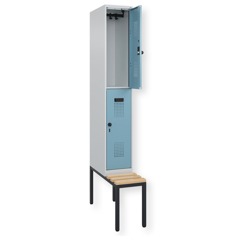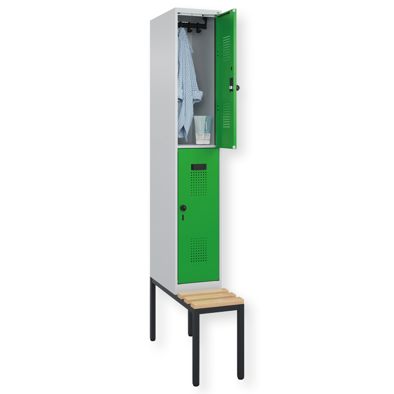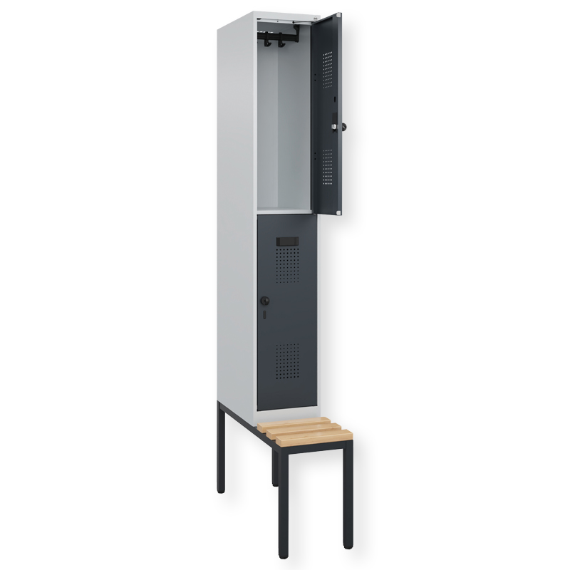 Doppelstöckiger Schrank Evolo PLUS, 1 Abteil mit 2 Fächern, Abteilbreite 300 mm, Korpus aus stabiler Stahlkonstruktion mit hochwertiger Einbrennbeschichtung für hohe UV- und Korrosionsbeständigkeit, mit hinteren Belüftungsöffnungen oben und unten, innen je Fach 1 stabile Garderobenstange aus Ovalprofil mit 3 verdrehsicheren Doppel-Schiebehaken inkl. Systemaufnahme, mit untergebauter Sitzbank, Gestell aus stabilem Vierkant-Stahlrohr 30 x 30 mm, mit verstellbaren Bodengleitern für einfachen Niveauausgleich, Türöffnungsbegrenzer 90 Grad, als Schutz vor Überdehnen der Tür, Tür(en) rechts angeschlagen, Stahl-Türen mit Soft-Anschlag und geschlossenen Seitenprofilen für höchste Stabilität, mit reinigungsfreundlichem Belüftungslochbild oben und unten, Aufhängung in stabilen Drehbolzen, 2 Ergonomische Sicherheits-Drehriegel für Vorhangschlösser mit Bügelstärke 6 bis 8 mm, inkl. Tür-Schutz, Sitzleisten aus Buche-Hartholz, im Profil ca. 60 x 30 mm, für guten Sitzkomfort, allseitig gehobelt, klarlackiert mit naturgegebenen Farbunterschieden, 2 Kunststoff-Etikettenrahmen, schwarz, selbstklebend, inkl. Klarsichtkunststoff-Abdeckung und weissem Etikett zur individuellen Beschriftung.