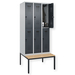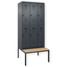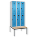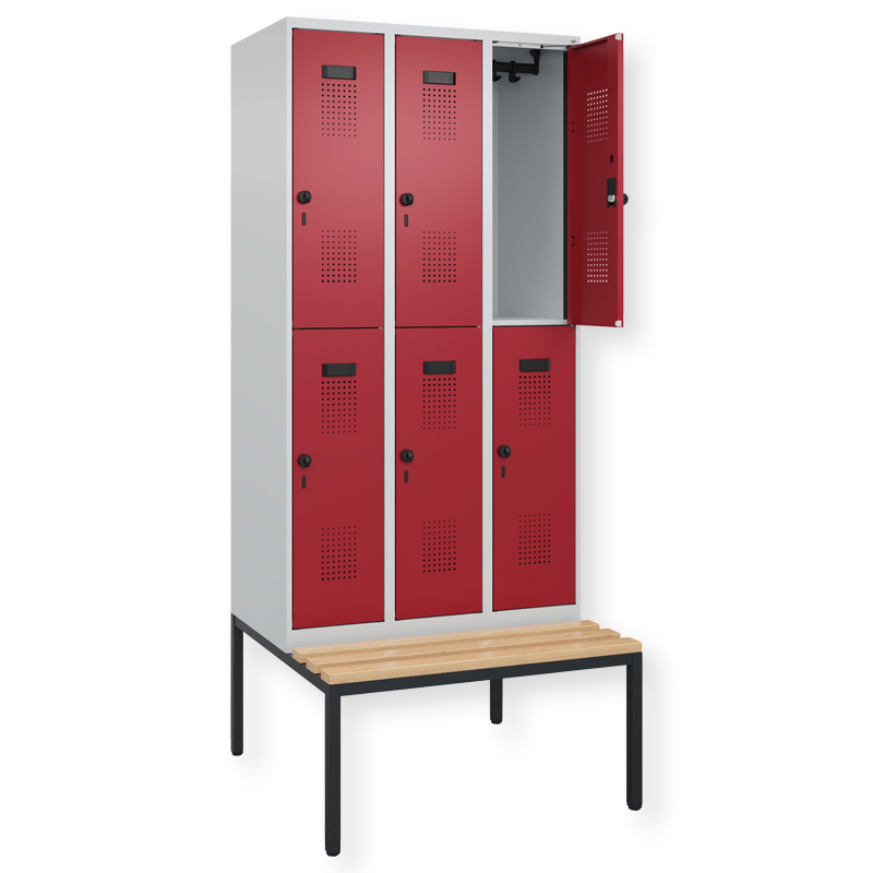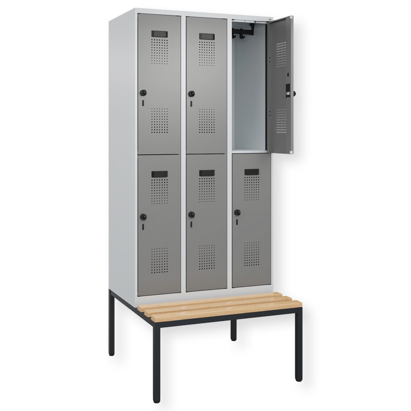 Doppelstöckiger Schrank Evolo PLUS, 1 Abteil mit 2 Fächern, Abteilbreite 300 mm, Korpus aus stabiler Stahlkonstruktion mit hochwertiger Einbrennbeschichtung für hohe UV- und Korrosionsbeständigkeit, mit hinteren Belüftungsöffnungen oben und unten, innen je Fach 1 stabile Garderobenstange aus Ovalprofil mit 3 verdrehsicheren Doppel-Schiebehaken inkl. Systemaufnahme, mit untergebauter Sitzbank, Gestell aus stabilem Vierkant-Stahlrohr 30 x 30 mm, mit verstellbaren Bodengleitern für einfachen Niveauausgleich, Türöffnungsbegrenzer 90 Grad, als Schutz vor Überdehnen der Tür, Tür(en) rechts angeschlagen, Stahl-Türen mit Soft-Anschlag und geschlossenen Seitenprofilen für höchste Stabilität, mit reinigungsfreundlichem Belüftungslochbild oben und unten, Aufhängung in stabilen Drehbolzen, 2 Ergonomische Sicherheits-Drehriegel für Vorhangschlösser mit Bügelstärke 6 bis 8 mm, inkl. Tür-Schutz, Sitzleisten aus Buche-Hartholz, im Profil ca. 60 x 30 mm, für guten Sitzkomfort, allseitig gehobelt, klarlackiert mit naturgegebenen Farbunterschieden, 2 Kunststoff-Etikettenrahmen, schwarz, selbstklebend, inkl. Klarsichtkunststoff-Abdeckung und weissem Etikett zur individuellen Beschriftung.