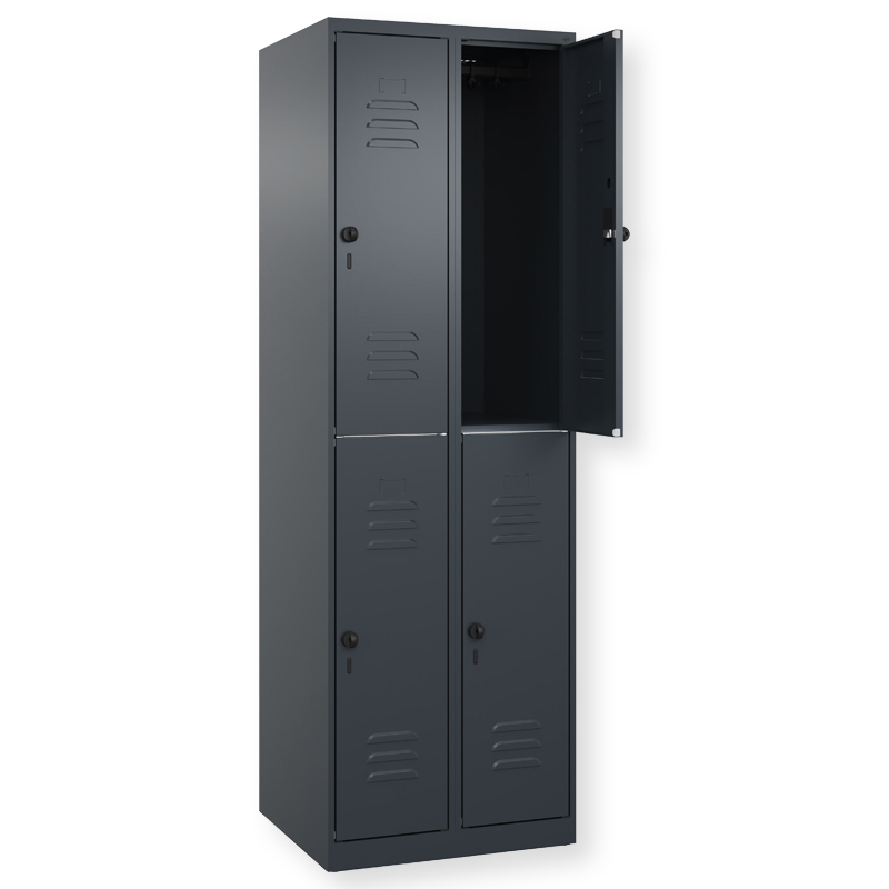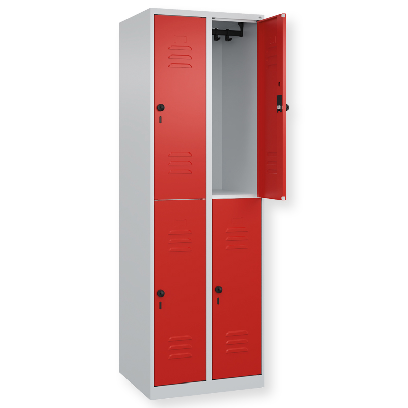 Doppelstöckiger Schrank Classic PLUS, 1 Abteil mit 2 Fächern, Abteilbreite 300 mm, Korpus aus stabiler Stahlkonstruktion mit hochwertiger Einbrennbeschichtung für hohe UV- und Korrosionsbeständigkeit, mit hinteren Belüftungsöffnungen oben und unten, innen je Fach 1 stabile Garderobenstange aus Ovalprofil mit 3 verdrehsicheren Doppel-Schiebehaken inkl. Systemaufnahme, mit Bodengleitern als praktischer Schrank- und Fussbodenschutz, Türöffnungen 110 Grad, Türaufhängung rechts, Stahl-Türen mit Soft-Anschlag und geschlossenen Seitenprofilen für hohe Stabilität, mit Lüftungskiemen oben und unten sowie eingestanztem Etikettenrahmen, Türaufhängung in stabilen Drehbolzen, 2 Ergonomische Sicherheits-Drehriegel für Vorhangschlösser mit Bügelstärke 6 bis 8 mm, inkl. Tür-Schutz, Masse (H x B x T): 1850 x 300 x 500 mm