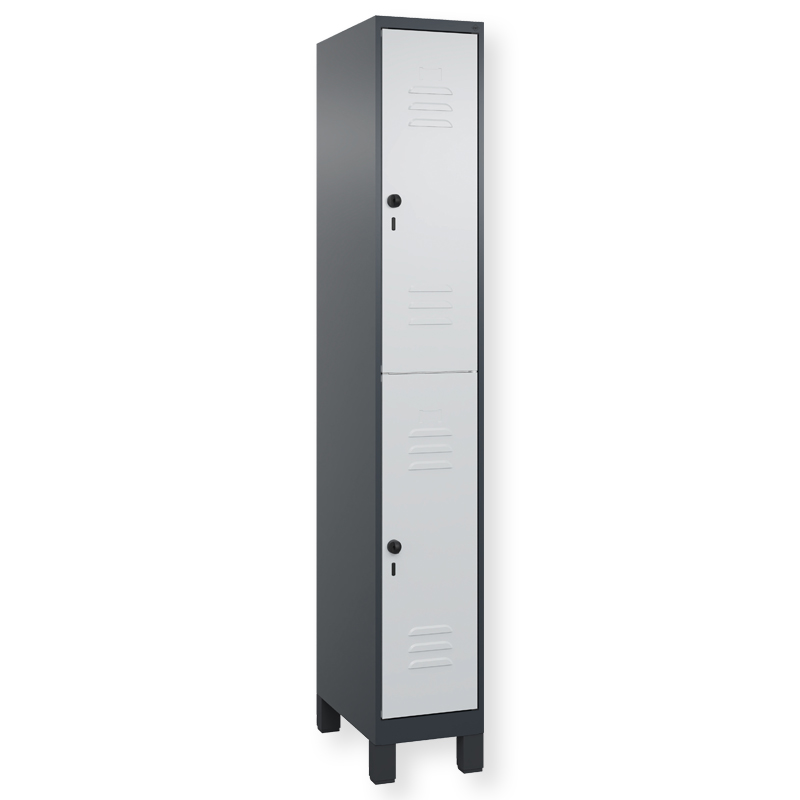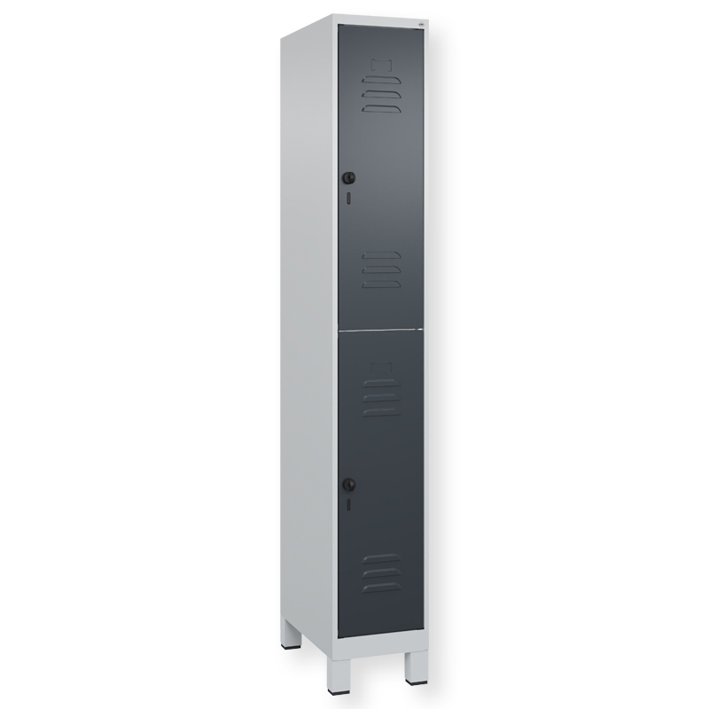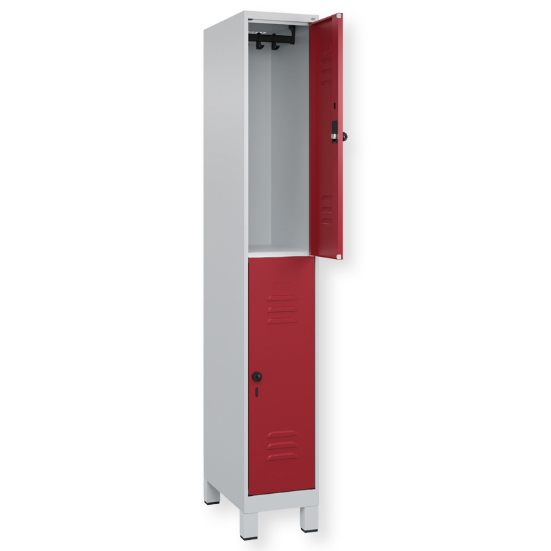 Doppelstöckiger Schrank Classic PLUS, 1 Abteil mit 2 Fächern, Abteilbreite 300 mm, Korpus aus stabiler Stahlkonstruktion mit hochwertiger Einbrennbeschichtung für hohe UV- und Korrosionsbeständigkeit, mit hinteren Belüftungsöffnungen oben und unten, innen je Fach 1 stabile Garderobenstange aus Ovalprofil mit 3 verdrehsicheren Doppel-Schiebehaken inkl. Systemaufnahme, Türöffnungen 110 Grad, Türaufhängung rechts, Stahl-Türen mit Soft-Anschlag und geschlossenen Seitenprofilen für hohe Stabilität, mit Lüftungskiemen oben und unten sowie eingestanztem Etikettenrahmen, Türaufhängung in stabilen Drehbolzen, 2 Ergonomische Sicherheits-Drehriegel für Vorhangschlösser mit Bügelstärke 6 bis 8 mm, inkl. Tür-Schutz, 100 mm hohe Füsse aus Kunststoff für erweiterten Korrosionsschutz.