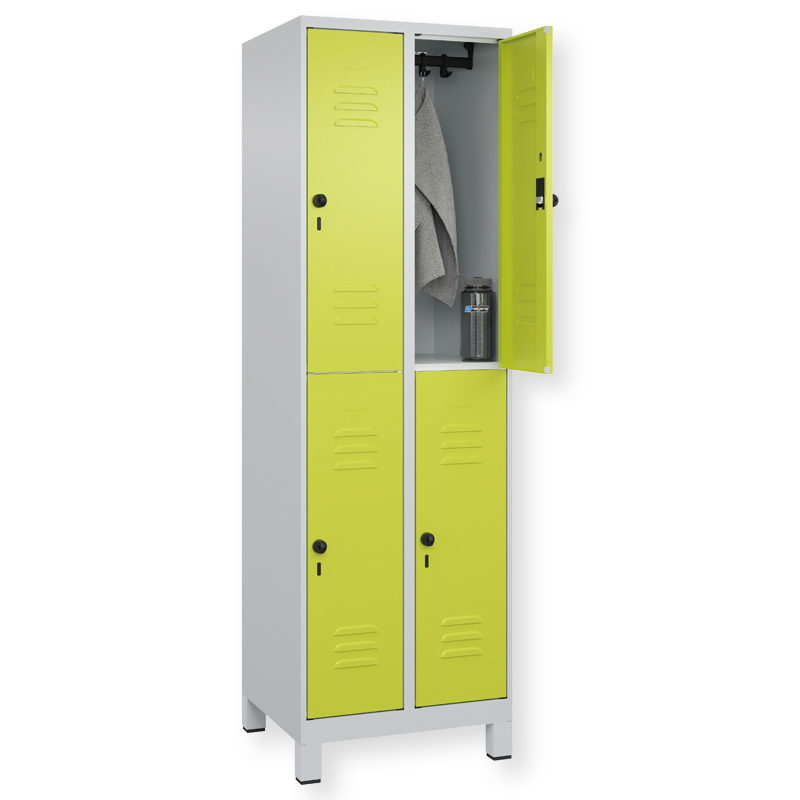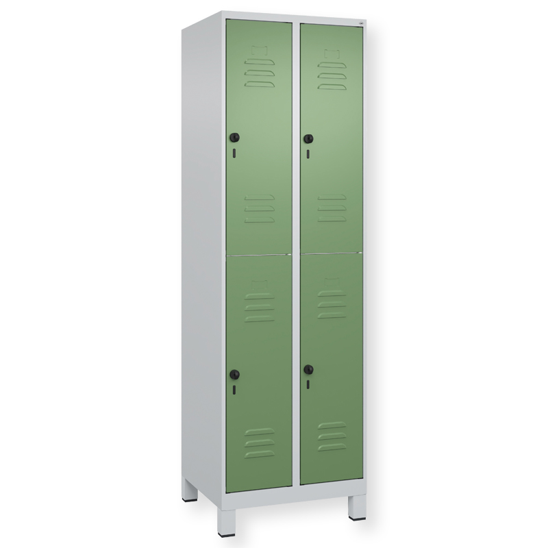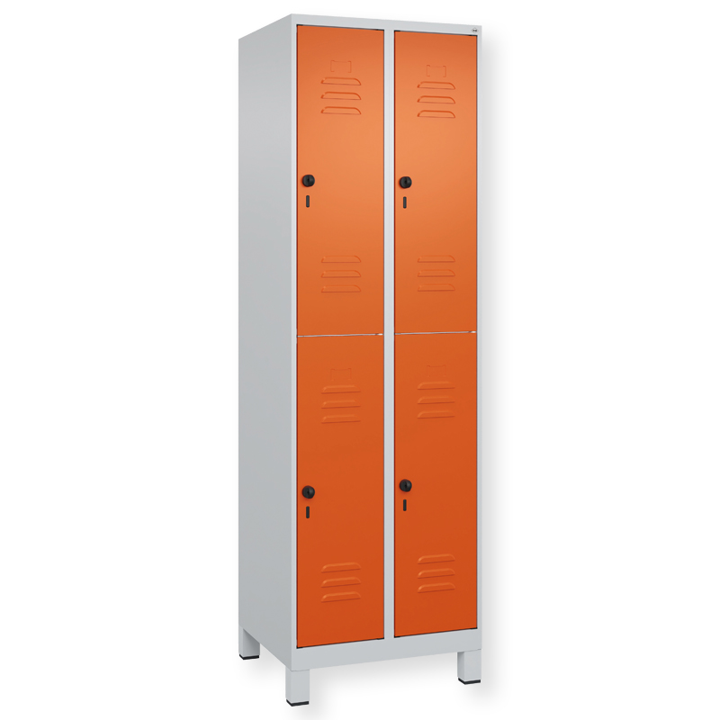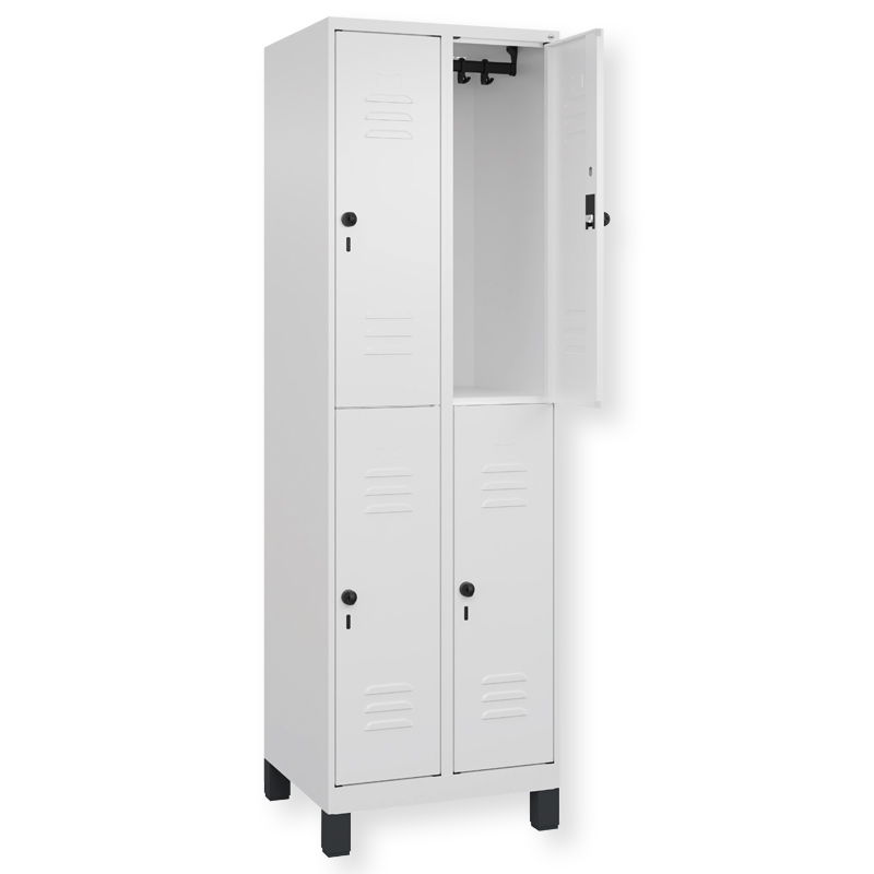 Doppelstöckiger Schrank Classic PLUS, 1 Abteil mit 2 Fächern, Abteilbreite 300 mm, Korpus aus stabiler Stahlkonstruktion mit hochwertiger Einbrennbeschichtung für hohe UV- und Korrosionsbeständigkeit, mit hinteren Belüftungsöffnungen oben und unten, innen je Fach 1 stabile Garderobenstange aus Ovalprofil mit 3 verdrehsicheren Doppel-Schiebehaken inkl. Systemaufnahme, Türöffnungen 110 Grad, Türaufhängung rechts, Stahl-Türen mit Soft-Anschlag und geschlossenen Seitenprofilen für hohe Stabilität, mit Lüftungskiemen oben und unten sowie eingestanztem Etikettenrahmen, Türaufhängung in stabilen Drehbolzen, 2 Ergonomische Sicherheits-Drehriegel für Vorhangschlösser mit Bügelstärke 6 bis 8 mm, inkl. Tür-Schutz, 100 mm hohe Füsse aus Kunststoff für erweiterten Korrosionsschutz.