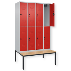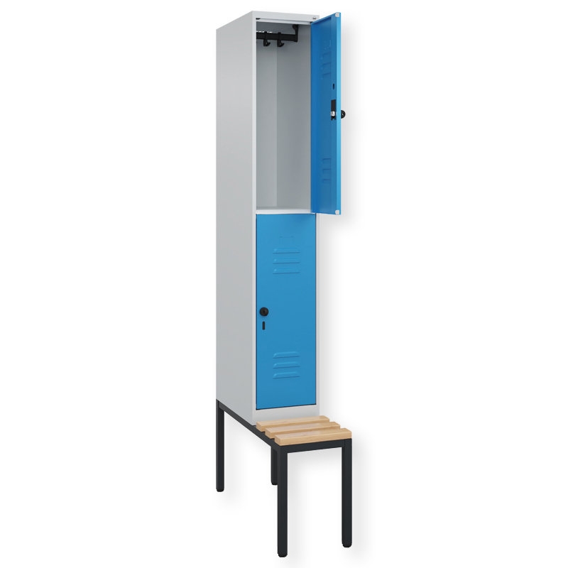 Doppelstöckiger Spind Classic PLUS, 1 Abteil mit 2 Fächern, Abteilbreite 300 mm, Korpus aus stabiler Stahlkonstruktion mit hochwertiger Einbrennbeschichtung für hohe UV- und Korrosionsbeständigkeit, mit hinteren Belüftungsöffnungen oben und unten, innen je Fach 1 stabile Garderobenstange aus Ovalprofil mit 3 verdrehsicheren Doppel-Schiebehaken inkl. Systemaufnahme, mit untergebauter Sitzbank, Gestell aus stabilem Vierkant-Stahlrohr 30 x 30 mm, mit verstellbaren Bodengleitern für einfachen Niveauausgleich, Türöffnungen 110 Grad, Türaufhängung rechts, Stahl-Türen mit Soft-Anschlag und geschlossenen Seitenprofilen für hohe Stabilität, mit Lüftungskiemen oben und unten sowie eingestanztem Etikettenrahmen, Türaufhängung in stabilen Drehbolzen, 2 Ergonomische Sicherheits-Drehriegel für Vorhangschlösser mit Bügelstärke 6 bis 8 mm, inkl. Tür-Schutz, Sitzleisten aus Buche-Hartholz, im Profil ca. 60 x 30 mm, für guten Sitzkomfort, allseitig gehobelt, klarlackiert mit naturgegebenen Farbunterschieden.