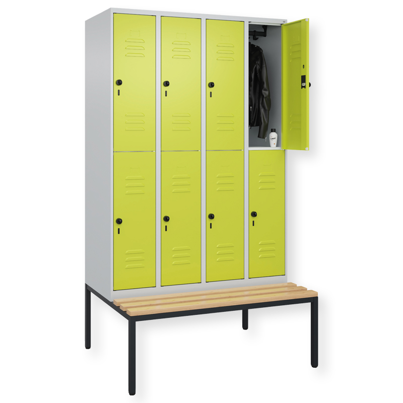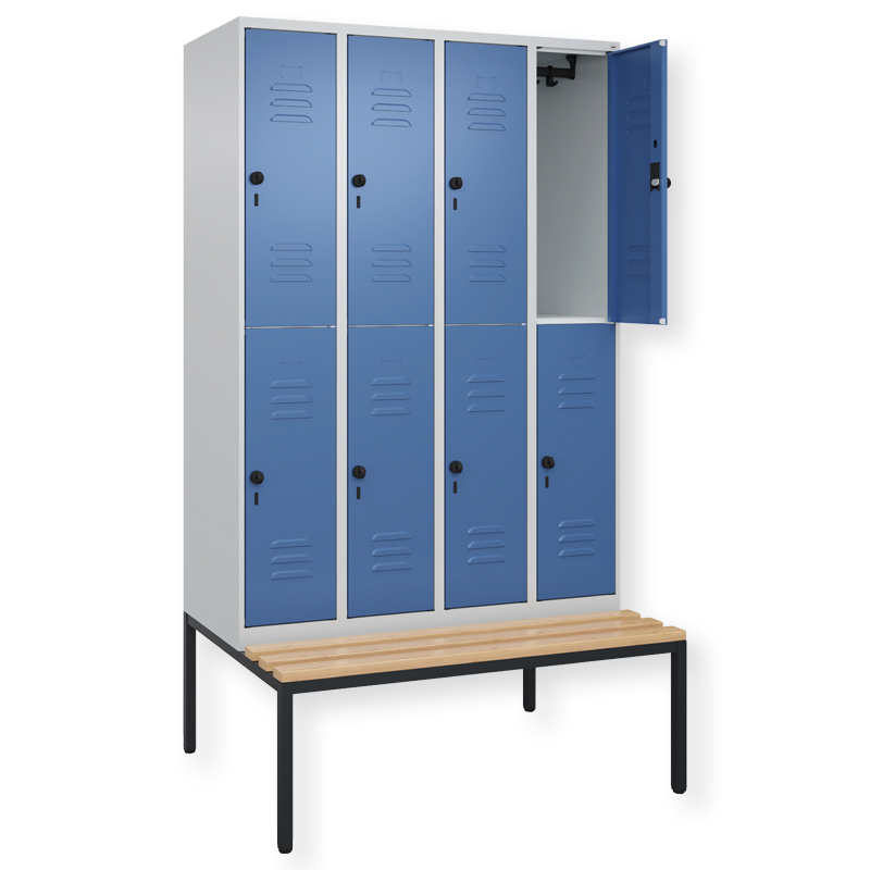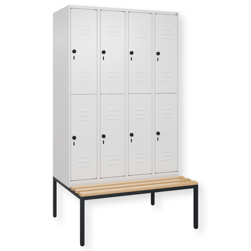 Doppelstöckiger Spind Classic PLUS, 1 Abteil mit 2 Fächern, Abteilbreite 300 mm, Korpus aus stabiler Stahlkonstruktion mit hochwertiger Einbrennbeschichtung für hohe UV- und Korrosionsbeständigkeit, mit hinteren Belüftungsöffnungen oben und unten, innen je Fach 1 stabile Garderobenstange aus Ovalprofil mit 3 verdrehsicheren Doppel-Schiebehaken inkl. Systemaufnahme, mit untergebauter Sitzbank, Gestell aus stabilem Vierkant-Stahlrohr 30 x 30 mm, mit verstellbaren Bodengleitern für einfachen Niveauausgleich, Türöffnungen 110 Grad, Türaufhängung rechts, Stahl-Türen mit Soft-Anschlag und geschlossenen Seitenprofilen für hohe Stabilität, mit Lüftungskiemen oben und unten sowie eingestanztem Etikettenrahmen, Türaufhängung in stabilen Drehbolzen, 2 Ergonomische Sicherheits-Drehriegel für Vorhangschlösser mit Bügelstärke 6 bis 8 mm, inkl. Tür-Schutz, Sitzleisten aus Buche-Hartholz, im Profil ca. 60 x 30 mm, für guten Sitzkomfort, allseitig gehobelt, klarlackiert mit naturgegebenen Farbunterschieden.