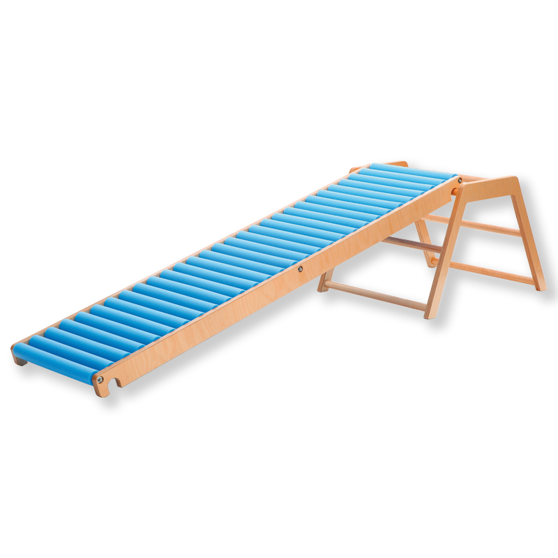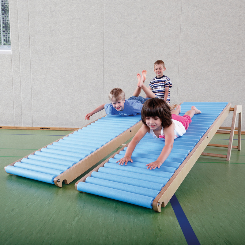 Die Rollenrutschen für Parcours und Bewegungslandschaften. Einfach in eine übliche Sprossenwand, in die Sportbox oder in die Trapez-Böcke einhängen und mit viel Spass die motorische Herausforderung geniessen. In Bauch- oder Rückenlage, vorwärts oder rückwärts, kniend oder sitzend können hier die Kinder herunter rollen.