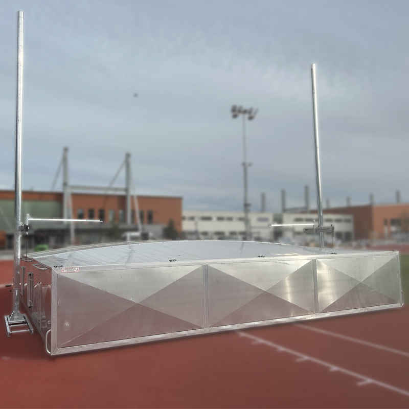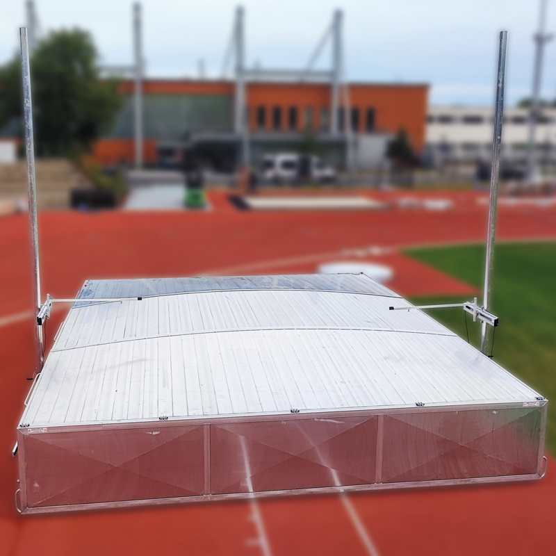 für Stabhochsprunganlagen. Vollverschweis-ste Aluminium-Konstruktion mit 4 starren Rädern. Besonders grosse Kunststoffräder ermöglichen ein leichtes Verschieben der Anlage. Die Abdeckungen werden vollverschweisst und zweiteilig geliefert. Die Räder sind verdeckt angeordnet. Die beiden Hälften werden mit einem Spannhebelverschluss fest zusammengedrückt. Die Abdeckungen sind abschliessbar. Lieferung ohne Schloss.