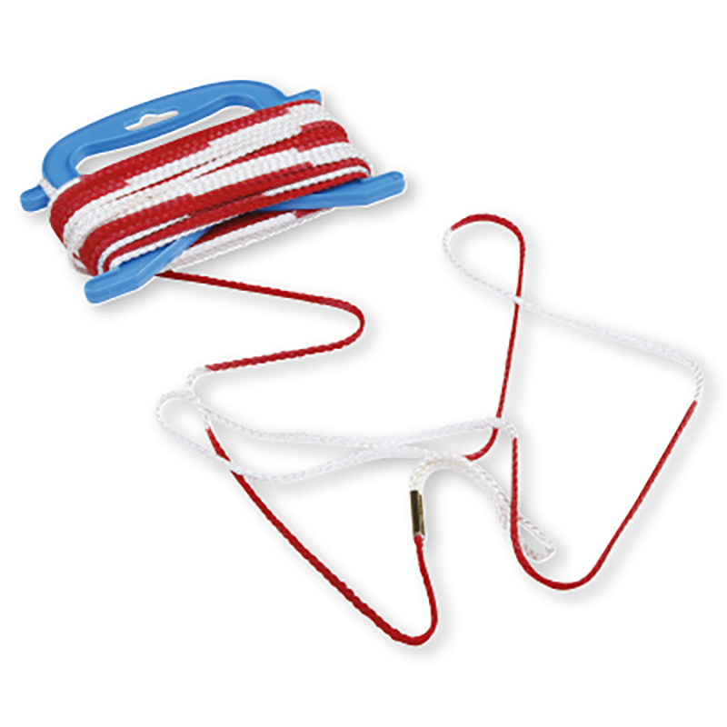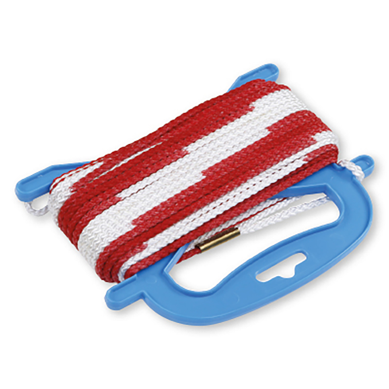 aus 5 mm starker Nylonkordel geflochten, im Abstand von 20 cm weiss-leuchtrot abgesetzt (verschiedene Kontrastfarben zum Einsatz je nach Lichtverhältnissen), an beiden Enden mit Schlaufen, 21 m lang.