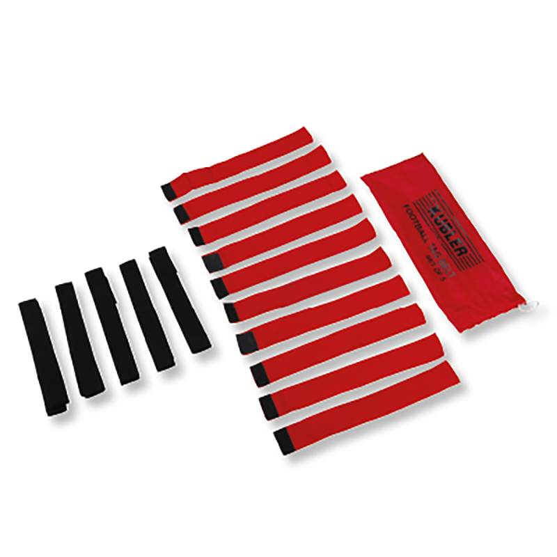 Flag Football Set ist für eine kontaktlose Variante des American Footballs. Flag Football ist eine tolle Abwechslung im Schulsport. Es kann nach den Regeln des Football gespielt werden. Anstatt des Körpereinsatzes wird dem Gegner eine Fahne abgezogen. Auch als Trainingseinheit (Kondition/Ausdauer) im Mannschaftssport in abgewandelter Spiel-Variante als Ausgleich einzusetzen. Ein gut hörbares Geräusch beim Abziehen der Flaggen erleichtert es dem Schiedsrichter und den Zuschauern den Überblick zu behalten. Ein Satz besteht aus fünf Gürteln mit einer Länge von 110 cm und 10 Fähnchen in einer Farbe. Durch das Klettverschluss System sind die Gürtel beliebig in der Länge verstellbar. Material des Flagfootball Sets ist aus 50% Polyester und 50% Polypropylen. Das Set kommt im Aufbewahrungsbeutel und mit einer Spielanleitung. Das Flag Football Set gibt es in der Farbe rot und gelb.
