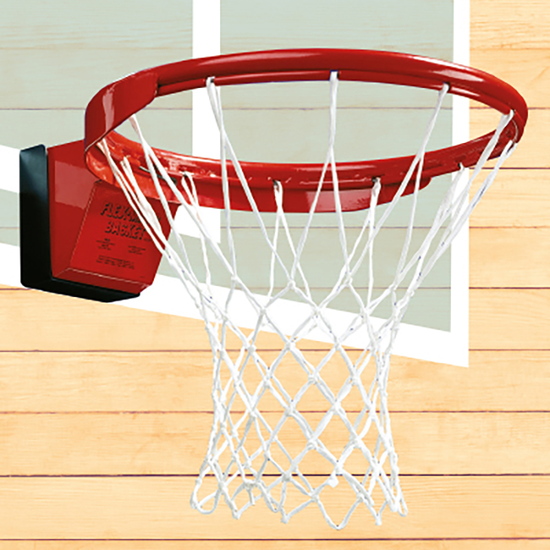 12-Punkt-Aufhängung. Wettspielkorb mit Stossdämpfermechanik. FIBA zugelassen. Superstabiler Korb mit seitlicher Flacheisenverstärkung, rot pulverbeschichtet. Dämpfermechanik in geschlossenem Gehäuse, mit Sicherheits-Netzbefestigung, Neigung ab ca. 105 kg Ringbelastung. (ohne Netz).