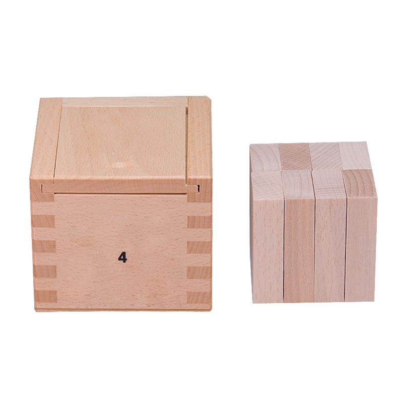 Die vierte Gabe besteht aus acht Ziegelsteinen, die durch vier Längsschnitte des Würfels gewonnen wurden. Mit diesen Steinen wurde in gleicher Weise verfahren wie mit den Würfeln der dritten Gabe. Die Einordnung der Bausteine in ein entsprechendes Kästchen ermöglicht ein gutes Ordnunghalten und lässt stets zu erkennen, ob alle Steine wieder vereint sind. Fröbel verfolgte damit den Gedanken, dem Kind zu zeigen, wie aus der EINHEIT DIE MANNIGFALTIGKEIT hervorgehen kann und wie sich die VIELFALT wieder zur GANZHEIT ordnen lässt. Dadurch schuf er ein bis heute gültiges Prinzip einer guten Baukastenordnung, die dem Kind immer die Übersicht bietet über das darin enthaltene Material und es zum Ordnunghalten anregt. Neue Varianten ergeben sich, wenn beide Gaben (drei und vier) miteinander kombiniert werden. So erschliessen sich weitere Gestaltungsmöglichkeiten, die das Kind wiederum zu neuen, ausdauernden Spielen anregen.