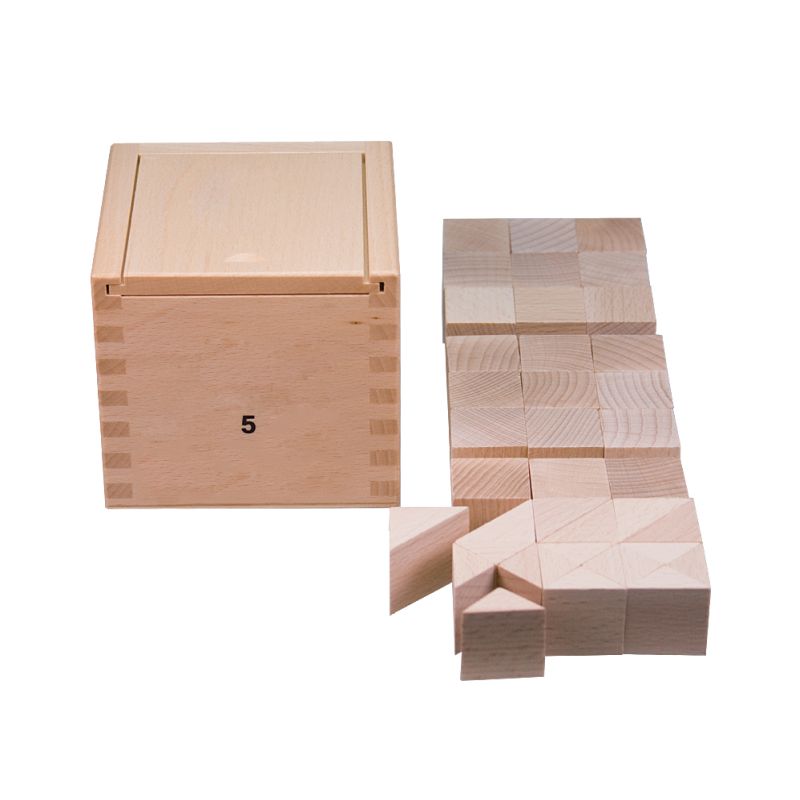 Die fünfte Gabe wurde von Fröbel aus der Abwandlung der dritten Gabe gewonnen. Dabei erhält der Würfelblock eine Teilung in drei Schichten, wobei zunächst 27 Würfel in kleinerer Form entstehen. Drei davon werden durch Diagonalschnitte nochmals in sechs Prismen zerlegt und drei weitere Würfel durch zwei Diagonalschnitte in insgesamt zwölf dementsprechende noch kleinere Prismen.