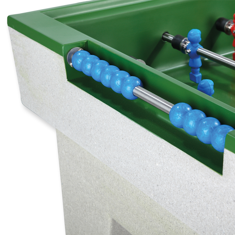 Konstruktion aus thermoplastischem Kunstharz und Fiberglas. Verbindungselemente aus rostfreiem Edelstahl. Spielstangen 16 mm zweifach verchromt. Spielfläche aus speziell temperiertem Glas. Witterungsresistente Gleitlager. Die Spielerfiguren sind extrem widerstandsfähig. Eingelassene Torzähler sowie Ballrücklauf auf beiden Seiten. Spielstangen gefedert mit perfektem Rückstosseffekt. Balleinwurfschalen in Höhe der Mittellinie beidseitig. Zusätzliche Ablagen rechts und links neben den Torzählern.