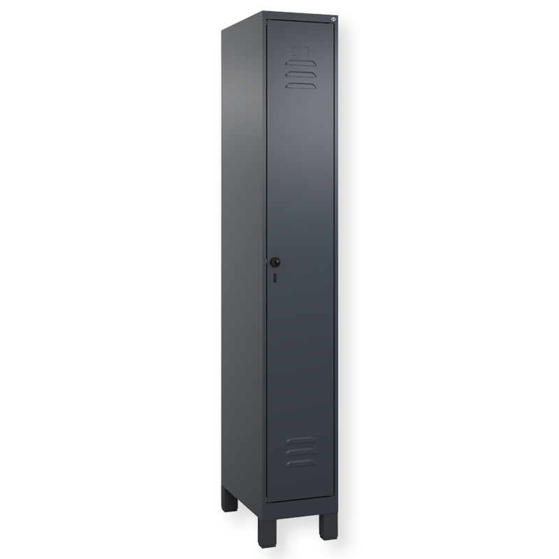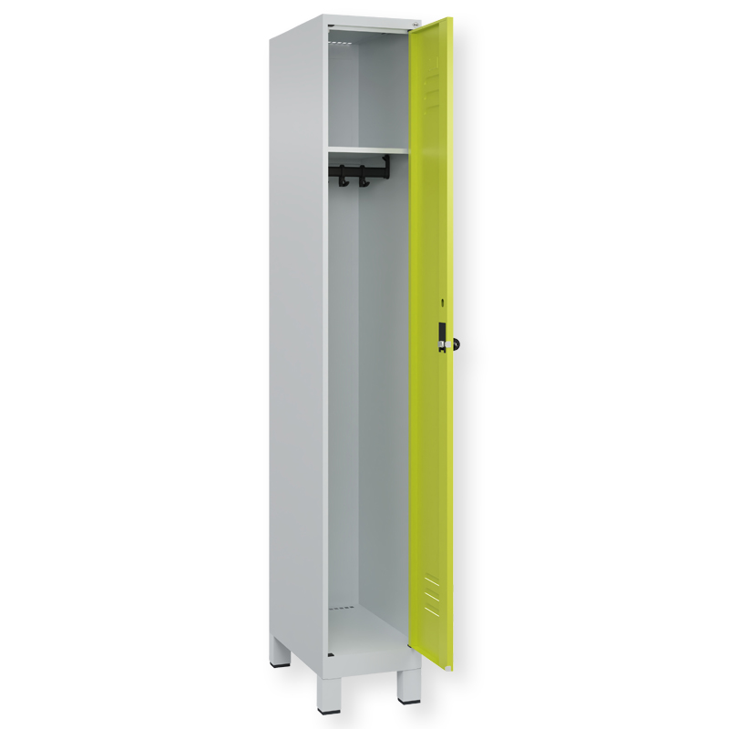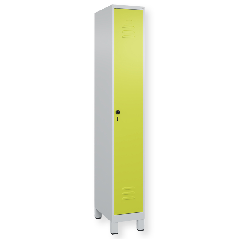 Spind Classic PLUS, Abteilbreite 300 mm, Korpus aus stabiler Stahlkonstruktion mit hochwertiger Einbrennbeschichtung für hohe UV- und Korrosionsbeständigkeit, mit hinteren Belüftungsöffnungen oben und unten, innen 1 Ablageboden, darunter 1 stabile Garderobenstange aus Ovalprofil mit 3 verdrehsicheren Doppel-Schiebehaken inkl. Systemaufnahme, mit Bodengleitern als praktischer Schrank- und Fussbodenschutz, Türöffnung 110 Grad, Türaufhängung rechts, Stahl-Türen mit Soft-Anschlag und geschlossenen Seitenprofilen für hohe Stabilität, mit Lüftungskiemen oben und unten sowie eingestanztem Etikettenrahmen, Türaufhängung in stabilen Drehbolzen, 1 Ergonomische Sicherheits-Drehriegel für Vorhangschloss mit Bügelstärke 6 bis 8 mm, inkl. Tür-Schutz.