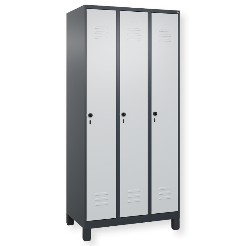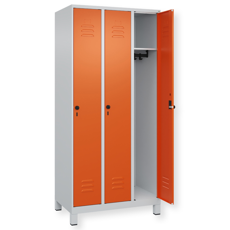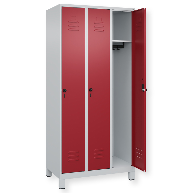 Spind Classic PLUS, Abteilbreite 300 mm, Korpus aus stabiler Stahlkonstruktion mit hochwertiger Einbrennbeschichtung für hohe UV- und Korrosionsbeständigkeit, mit hinteren Belüftungsöffnungen oben und unten, innen 1 Ablageboden, darunter 1 stabile Garderobenstange aus Ovalprofil mit 3 verdrehsicheren Doppel-Schiebehaken inkl. Systemaufnahme, mit Bodengleitern als praktischer Schrank- und Fussbodenschutz, Türöffnung 110 Grad, Türaufhängung rechts, Stahl-Türen mit Soft-Anschlag und geschlossenen Seitenprofilen für hohe Stabilität, mit Lüftungskiemen oben und unten sowie eingestanztem Etikettenrahmen, Türaufhängung in stabilen Drehbolzen, 1 Ergonomische Sicherheits-Drehriegel für Vorhangschloss mit Bügelstärke 6 bis 8 mm, inkl. Tür-Schutz.