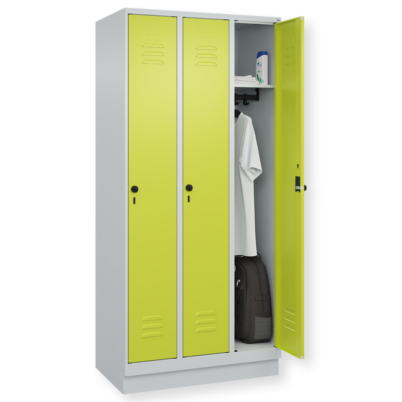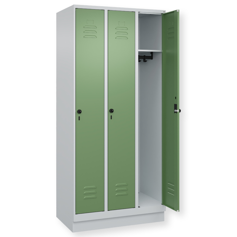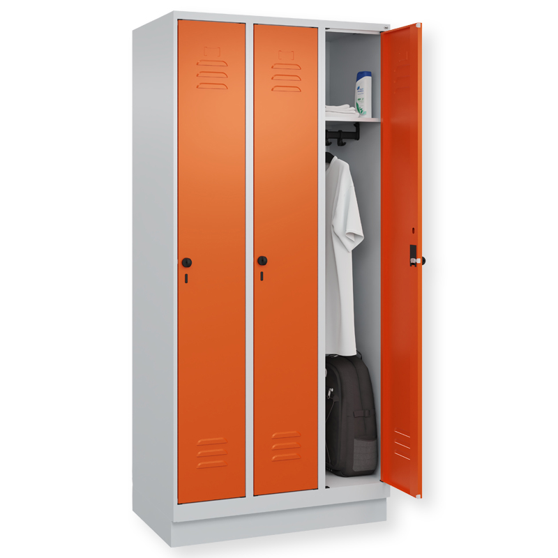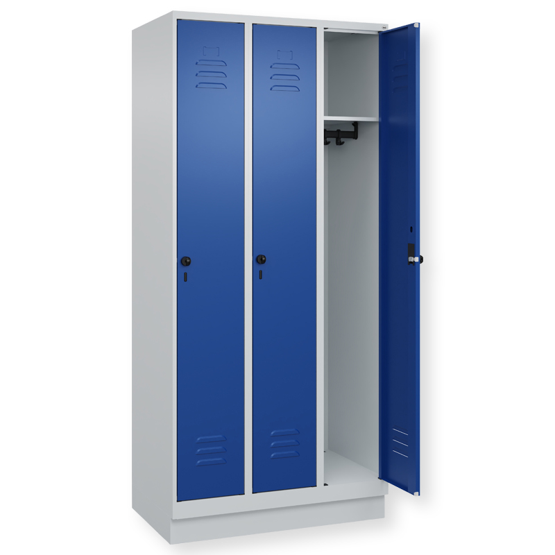 Garderobenschrank Classic PLUS, Abteilbreite 300 mm, Korpus aus stabiler Stahlkonstruktion mit hochwertiger Einbrennbeschichtung für hohe UV- und Korrosionsbeständigkeit, mit hinteren Belüftungsöffnungen oben und unten, innen 1 Ablageboden, darunter 1 stabile Garderobenstange aus Ovalprofil mit 3 verdrehsicheren Doppel-Schiebehaken inkl. Systemaufnahme, auf 100 mm hohem Sockel, Türöffnung 110 Grad, Türaufhängung rechts, Stahl-Türen mit Soft-Anschlag und geschlossenen Seitenprofilen für hohe Stabilität, mit Lüftungskiemen oben und unten sowie eingestanztem Etikettenrahmen, Türaufhängung in stabilen Drehbolzen, 1 Ergonomische Sicherheits-Drehriegel für Vorhangschloss mit Bügelstärke 6 bis 8 mm, inkl. Tür-Schutz.