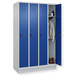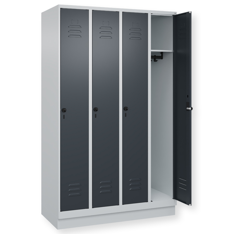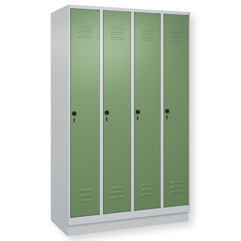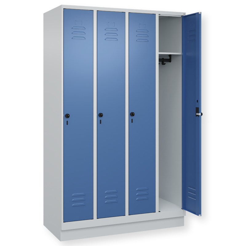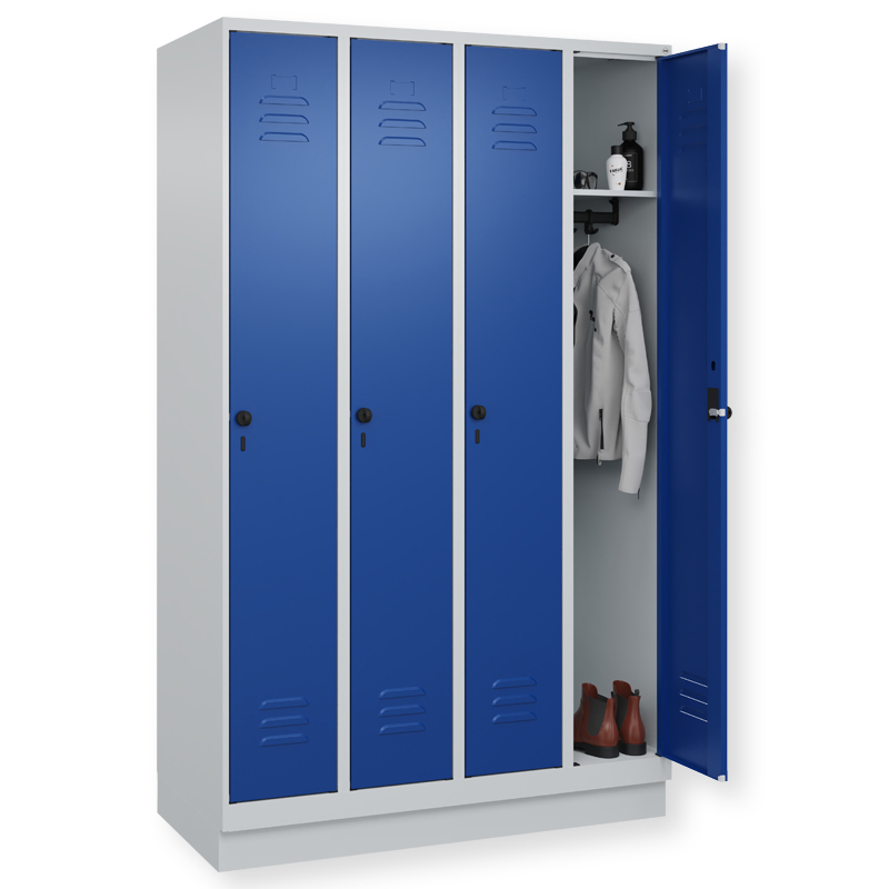 Garderobenschrank Classic PLUS, Abteilbreite 300 mm, Korpus aus stabiler Stahlkonstruktion mit hochwertiger Einbrennbeschichtung für hohe UV- und Korrosionsbeständigkeit, mit hinteren Belüftungsöffnungen oben und unten, innen 1 Ablageboden, darunter 1 stabile Garderobenstange aus Ovalprofil mit 3 verdrehsicheren Doppel-Schiebehaken inkl. Systemaufnahme, auf 100 mm hohem Sockel, Türöffnung 110 Grad, Türaufhängung rechts, Stahl-Türen mit Soft-Anschlag und geschlossenen Seitenprofilen für hohe Stabilität, mit Lüftungskiemen oben und unten sowie eingestanztem Etikettenrahmen, Türaufhängung in stabilen Drehbolzen, 1 Ergonomische Sicherheits-Drehriegel für Vorhangschloss mit Bügelstärke 6 bis 8 mm, inkl. Tür-Schutz.