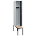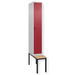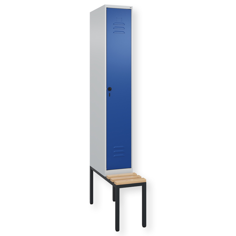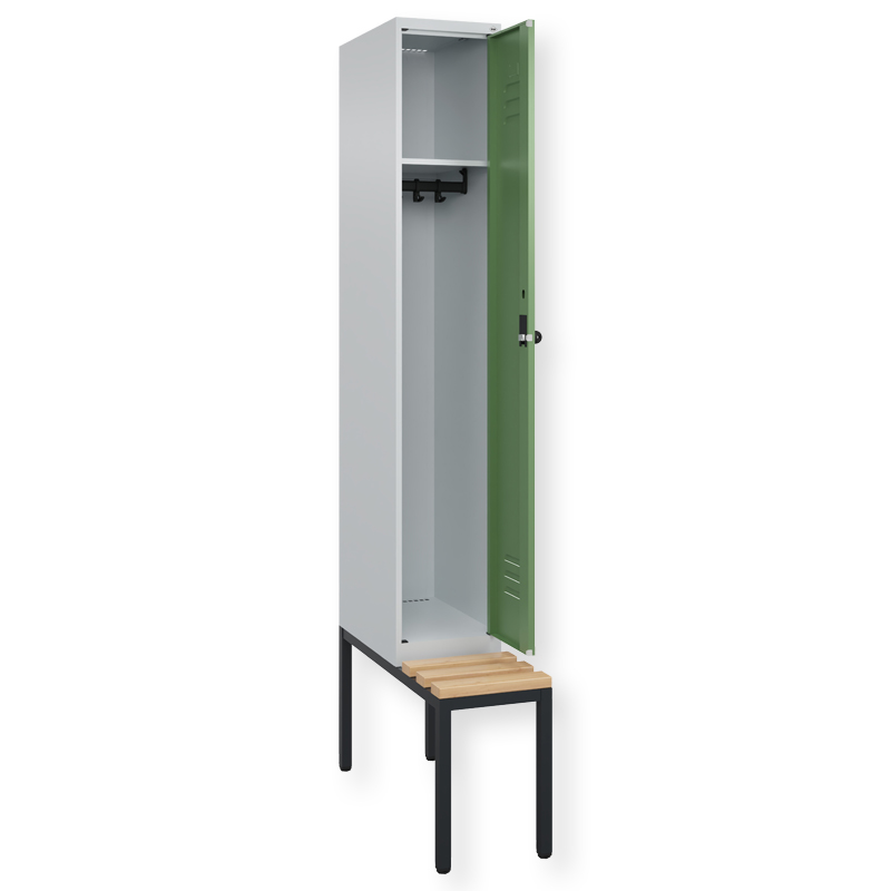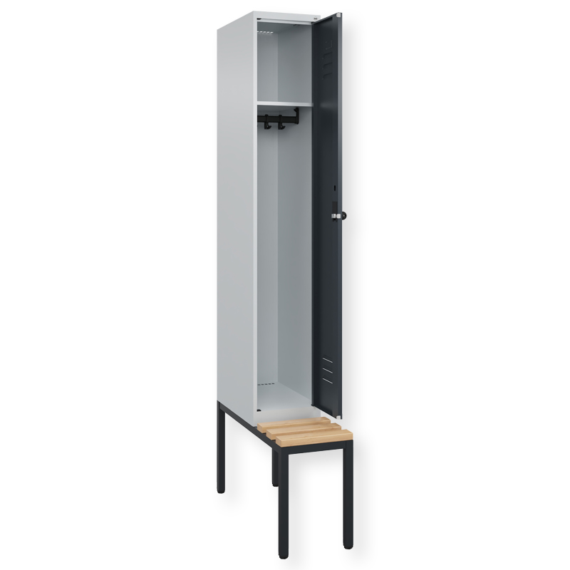 Spind Classic PLUS, 1 Abteil, Abteilbreite 300 mm, Korpus aus stabiler Stahlkonstruktion mit hochwertiger Einbrennbeschichtung für hohe UV- und Korrosionsbeständigkeit, mit hinteren Belüftungsöffnungen oben und unten, innen 1 Ablageboden, darunter 1 stabile Garderobenstange aus Ovalprofil mit 3 verdrehsicheren Doppel-Schiebehaken inkl. Systemaufnahme, mit untergebauter Sitzbank, Gestell aus stabilem Vierkant-Stahlrohr 30 x 30 mm, mit verstellbaren Bodengleitern für einfachen Niveauausgleich, Türöffnung 110 Grad, Türaufhängung rechts, Stahl-Türen mit Soft-Anschlag und geschlossenen Seitenprofilen für hohe Stabilität, mit Lüftungskiemen oben und unten sowie eingestanztem Etikettenrahmen, Türaufhängung in stabilen Drehbolzen, 1 Ergonomische Sicherheits-Drehriegel für Vorhangschloss mit Bügelstärke 6 bis 8 mm, inkl. Tür-Schutz, Sitzleisten aus Buche-Hartholz, im Profil ca. 60 x 30 mm, für guten Sitzkomfort, allseitig gehobelt, klarlackiert mit naturgegebenen Farbunterschieden.