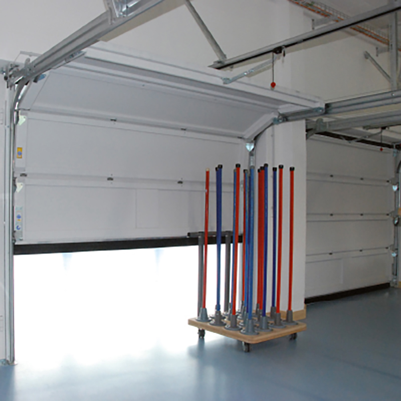 Dieser Tortyp ist bei Garagentoren längst zum Standard geworden. Ein Sektionaltor öffnet senkrecht nach oben und schwenkt weder nach aussen noch nach innen. Dadurch lässt sich der Platz im Geräteraum optimal nutzen.