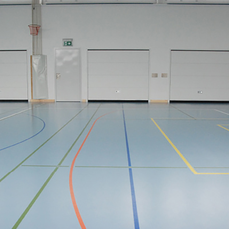 Das Sporthallen-Sektionaltor wird aus Holzverbundplatten gefertigt und flächenbündig mit der Hallenverkleidung bzw. dem Prallwand-Aufbau montiert. Auf Wunsch kann die Torfläche auch mit textilem Prallwand-Belag belegt werden. Der Gewichtsausgleich erfolgt über eine Torsionsfederwelle mit geprüfter Federbruchsicherung. Mit einem elektrischen Antrieb lässt sich das Tor auch automatisch bedienen.