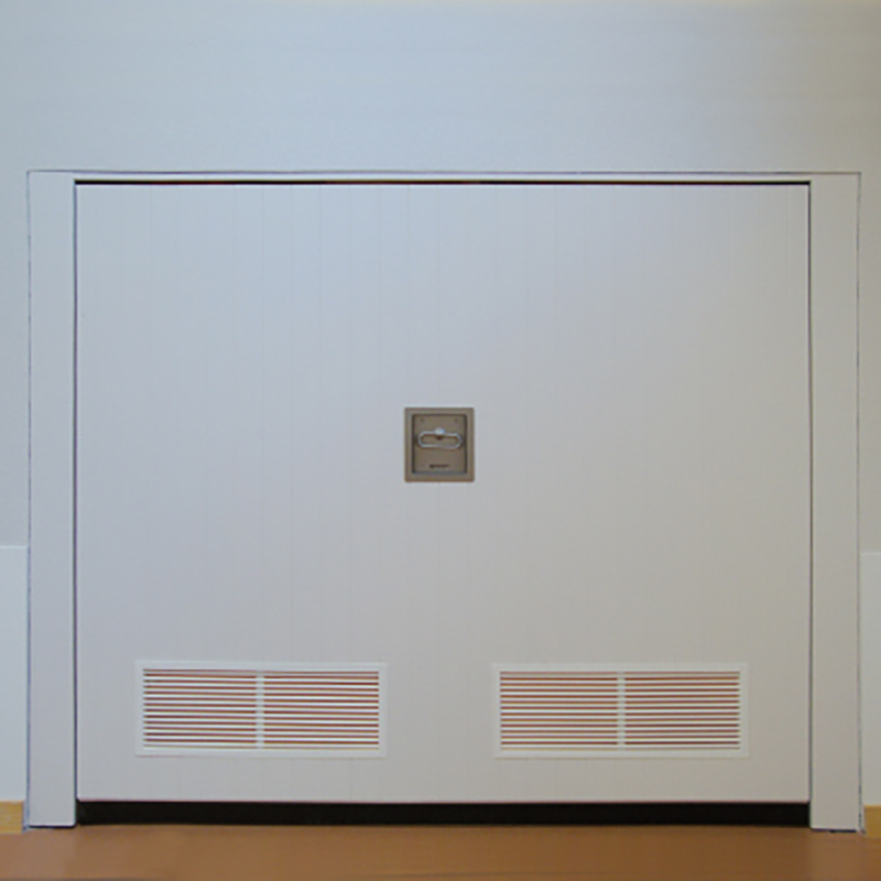 Beim Gegengewichtstor Typ 32 mit Standardbeschlag befindet sich das Torblatt bei offenem Tor auf gleicher Höhe wie die Laufschienen. Auf Wunsch bieten wir auch eine Niedrigsturz-Lösung an.