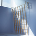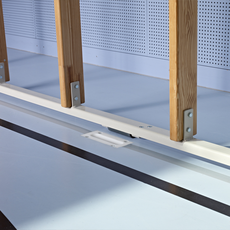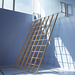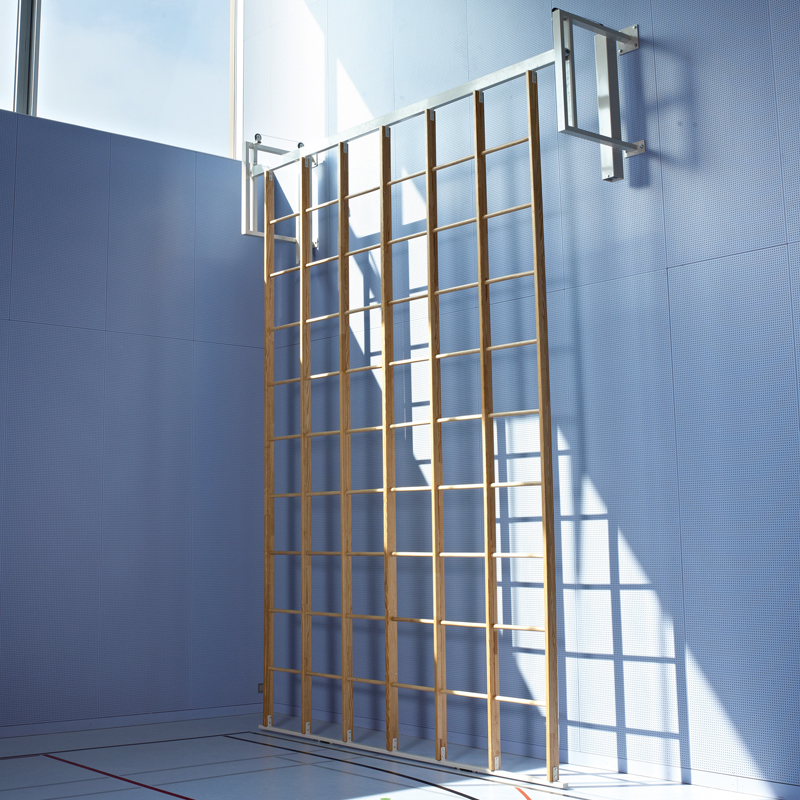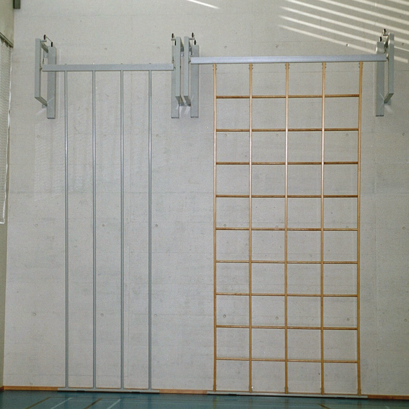 Leiter aus Holz, zum Klettern senkrecht oder schräg nach vorn rollbar. Versorgt wird die Gitterleiter schräg nach hinten an die Wand. Bodentraverse auf Kunststoffwalzen laufend. Bodenschalen aus Kunststoff für senkrechte Stellung der Stangen. Wandkonsolen mit Gegengewichten.