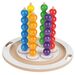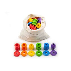 - 6 Stecktürme mit jeweils 6 grossen Holzkugeln 50 mm Durchmesser in den Farben des Regenbogens rot, orange, gelb, hellgrün, hellblau, violett.