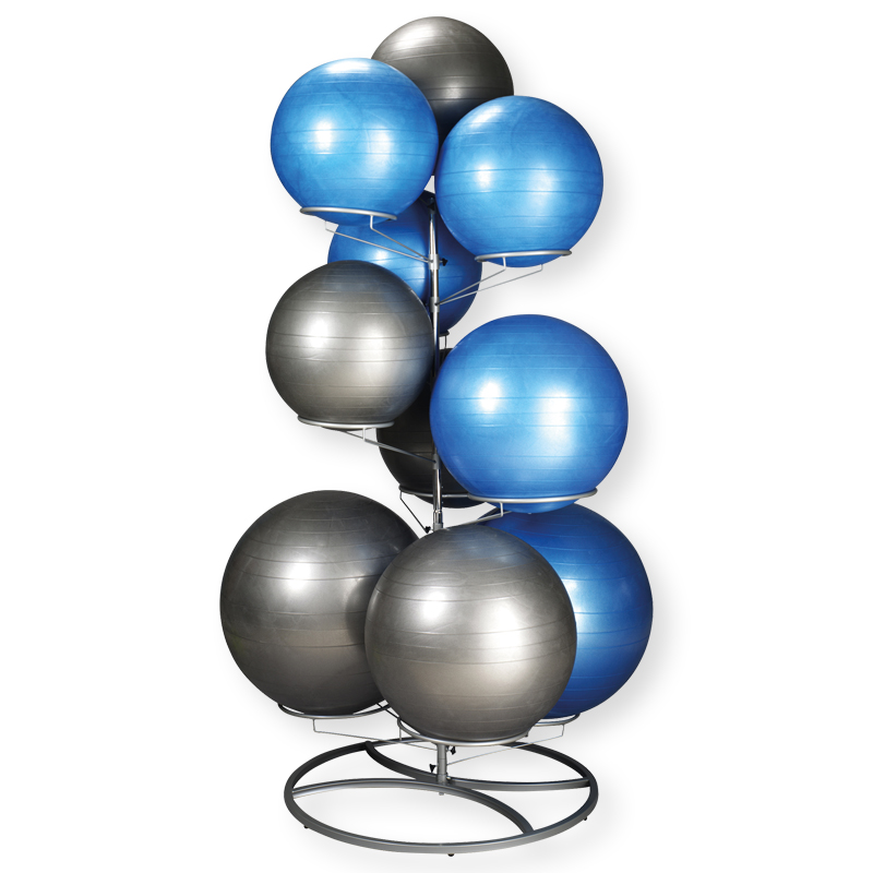 Dieser Gymnastikballständer lagert die Bälle vertikal und spiralförmig, sodass bis zu 10 Gymnastikbälle relativ platzsparend aufbewahrt werden. Die 10 Aufnahmeflächen sind rotierbar und höhenverstellbar.