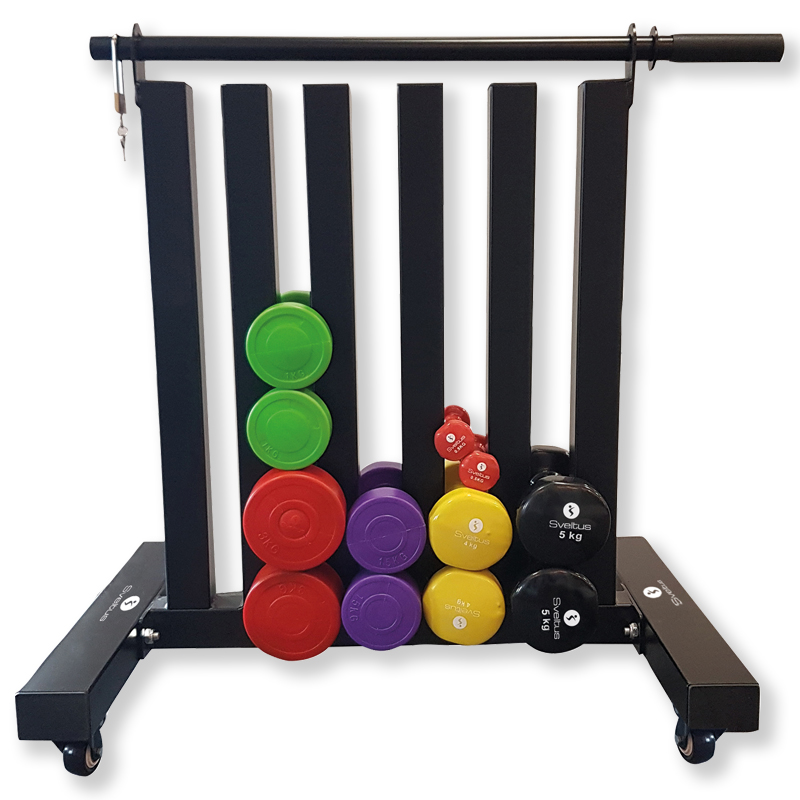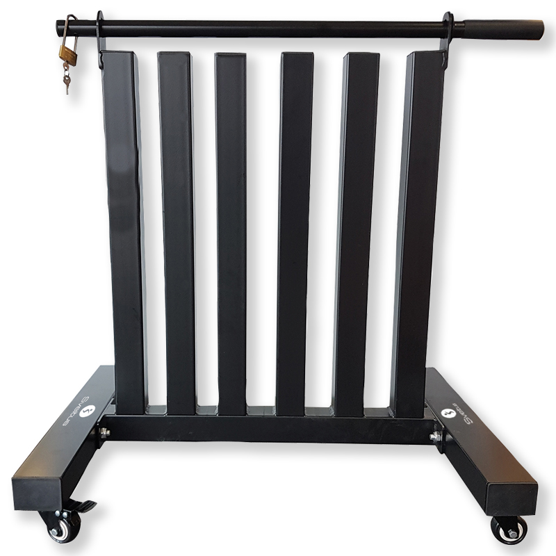 Leichtgängige Rollen sorgen dafür, dass die Hanteln immer da sind, wo sie auch gebraucht werden und danach ebenso schnell und problemlos wieder im Hintergrund verschwinden. Hergestellt aus stabilen, schwarz lackierten Metallprofilen nimmt der Hantel-Ständer auch mal eine unsanfte Behandlung nicht krumm. Abschliessbar mit im Lieferumfang enthaltenem Vorhängeschloss.