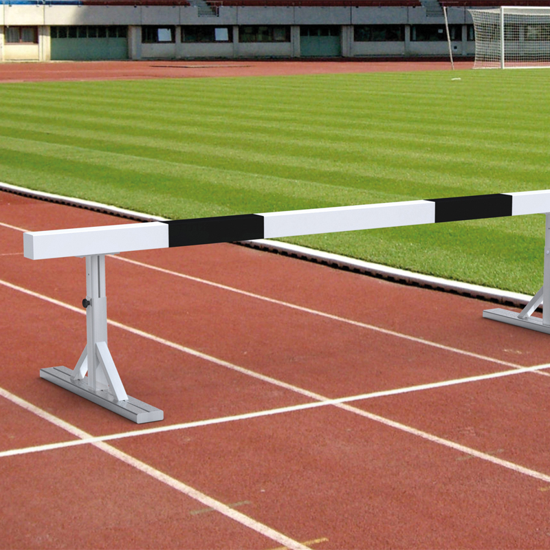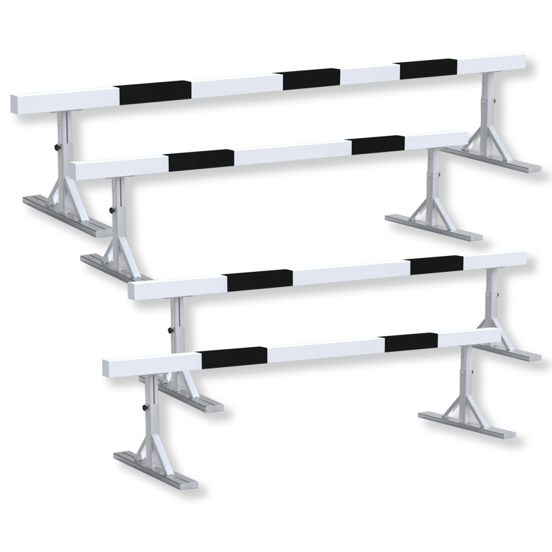 Hindernishürdensatz für die höchsten Ansprüche, bestehend aus 4 Hindernishürden für den 2000 m und 3000 m Hindernislauf der Frauen und Männer. Die Gesamthöhe für Männer sind 91,4 cm, für Frauen 76,2 cm. Die Hürden lassen sich leicht verstellen. Der verleimte Holzbalken garantiert einen langlebigen Einsatz, auch bei Wind und Wetter. Die Stahlfüsse lassen sich abnehmen. Das Set ist IAAF zertifizie