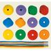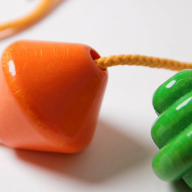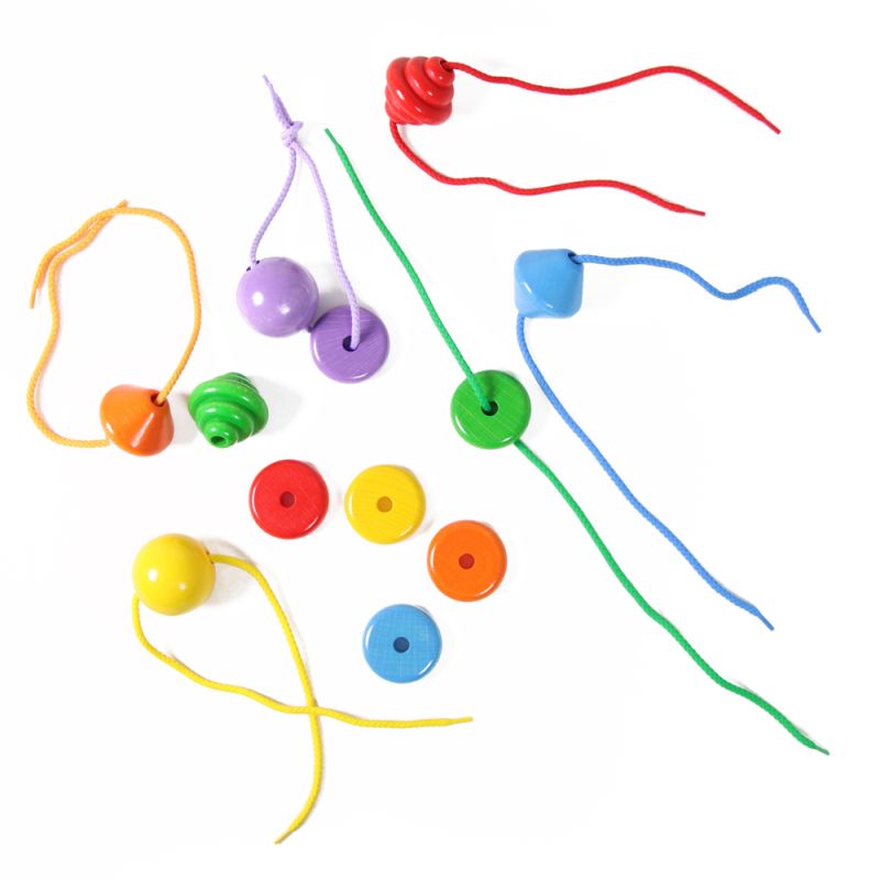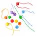 Fädelspiel für ganz kleine Hände. Alle Holzperlen haben einen Durchmesser von 50 mm. Grosse Bohrungen ermöglichen auch ganz kleinen Händen ein leichtes Durchfädeln der extra dicken Schnüre mit harten Enden. Die Kugeln und Schnüre sind farblich genau aufeinander abgestimmt in den fröhlichen Farben des Regenbogens rot, orange, gelb, grün, blau, violett.